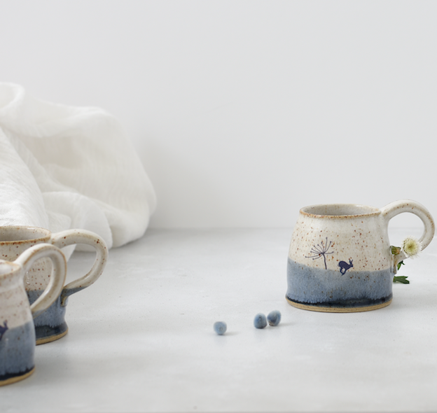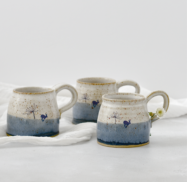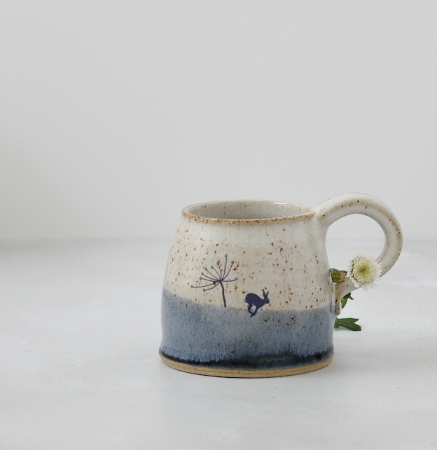 A rustic ceramic mug handthrown of strong flecked stoneware clay that fits comfortably in the hand. The running hare and tree drawn by Zanna are fused deep into the glaze.
