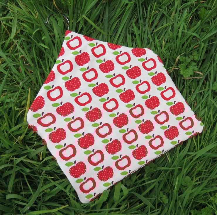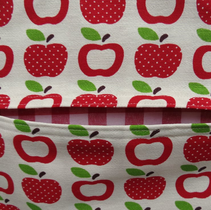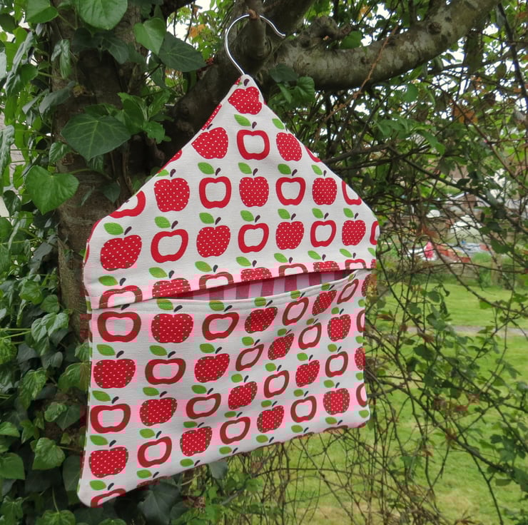 This is a peg bag with a red apples design.