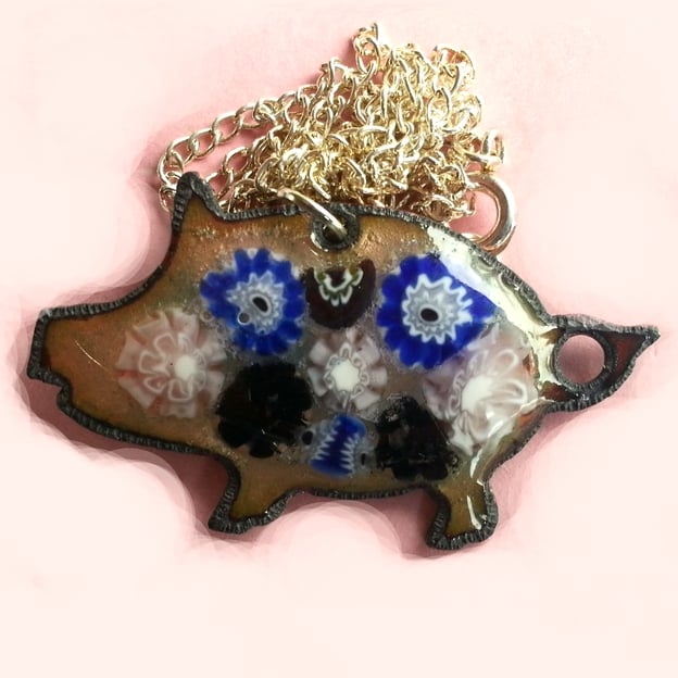 I made it by first building layers of clear enamel on the copper shape. Over this I arranged a pattern of millefiore beads.