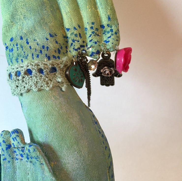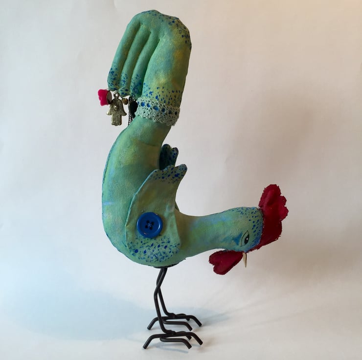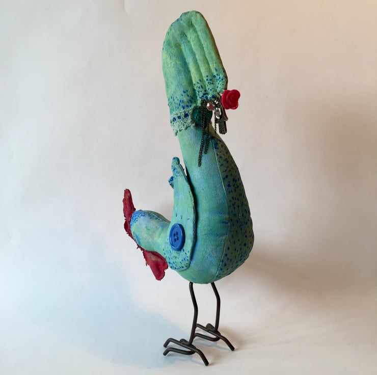 As a tribute to all things spring like I have created this little folk rooster. Hand and machine stitched as well as hand painted in spring green with distressed yellow he is speckled with Royal blue. He has a fine crest and wattle in vintage red, and his tail has little folk charms attached ( repurposed from a pair of favourite earrings which sadly one was lost) on his wings blue buttons sit decoratively, the whole piece mounted on metal legs.
