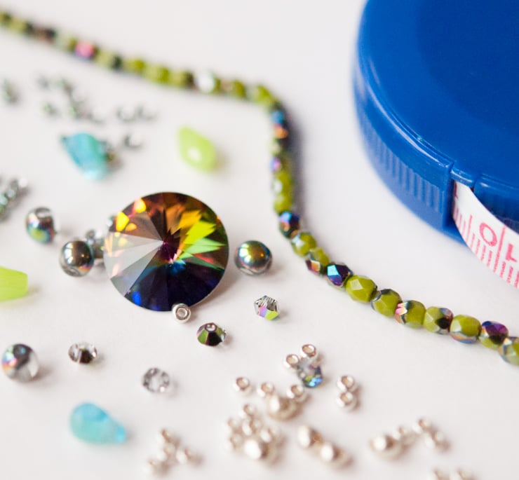 All of the beads you need to make one of my Baroque Tape Measure Srrounds, plus the right tape measure. The pack includes Swarovski Rivolis; Swarovski Bicones; Miyuki seed beads and drops; Czech fire polished crystals and round beads and bonus feature beads from my collection, so you can design and make your own unique tape end using the techniques you've just tried. Beads sent may vary very slightly from those shown in the photos, as sometimes I can't get exactly the same ones, but they will always be just as lovely or even lovelier.
