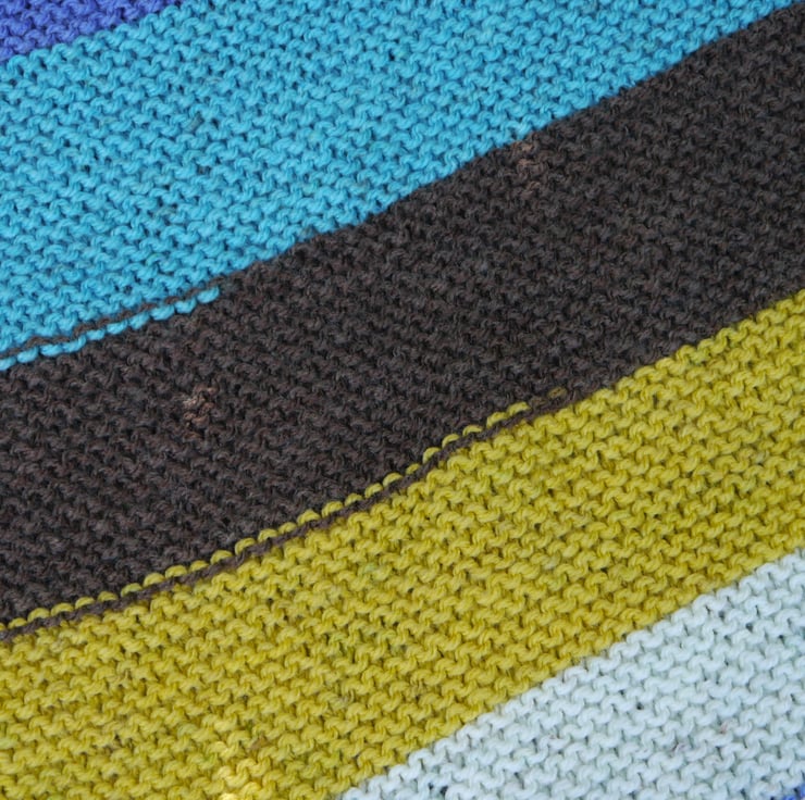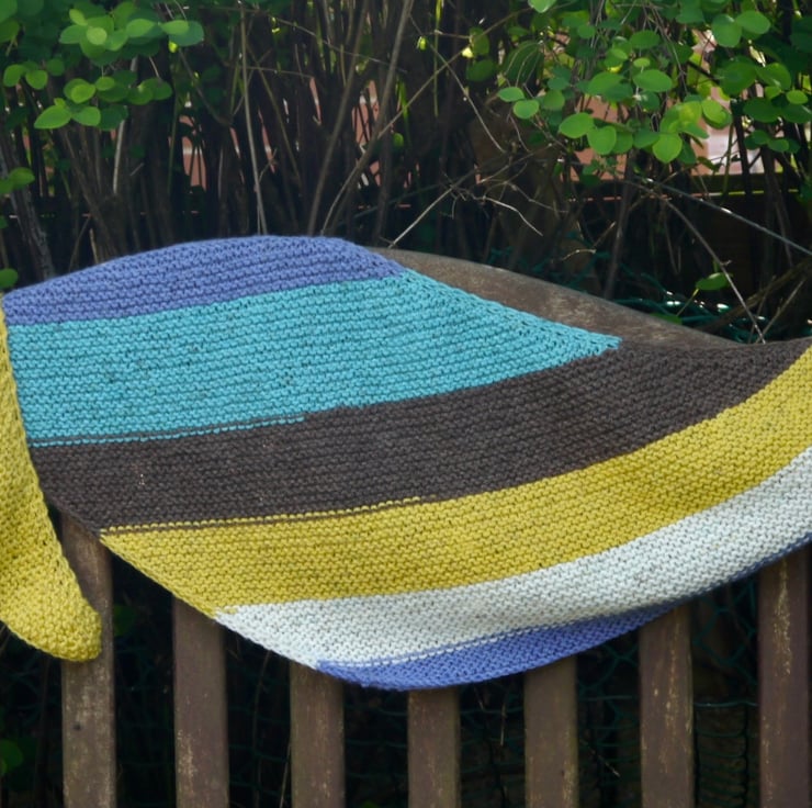 A beautifully soft and chunky hand knitted wrap. Can be worn in several different ways. I have knitted it using a lovely soft acrylic and wool mix yarn (80% acrylic, 20% wool) which is self striping giving a lovely unique look. The stripes are in shades that remind me of the seaside, blue, cream, yellow, brown and turquoise.