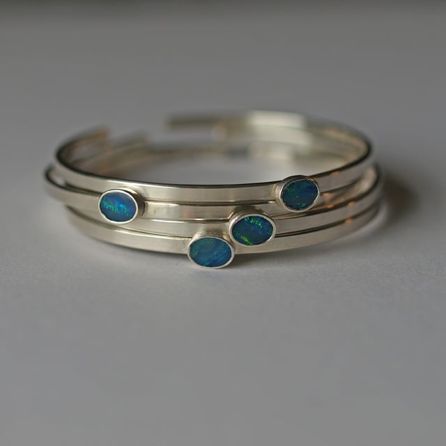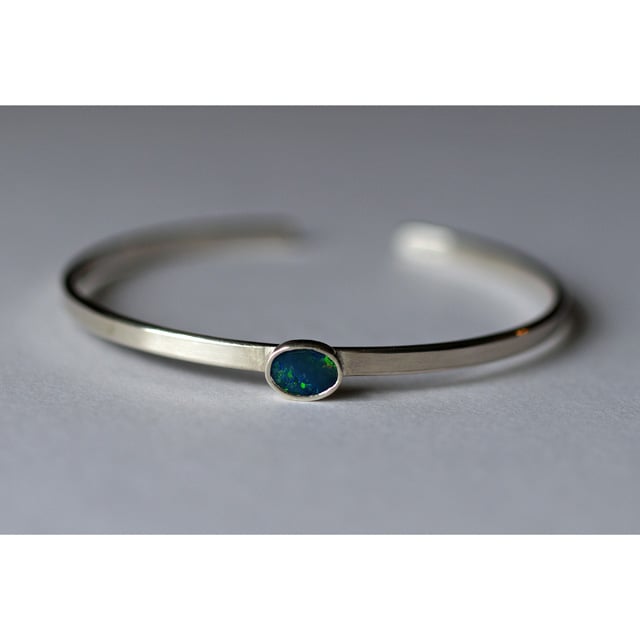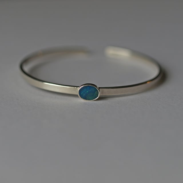 The cuff has been handmade in recycled sterling silver and has been set with an 8 x 6mm oval opal doublet. The opal doublet is a genuine opal slice that has been attached to an ironstone backing.