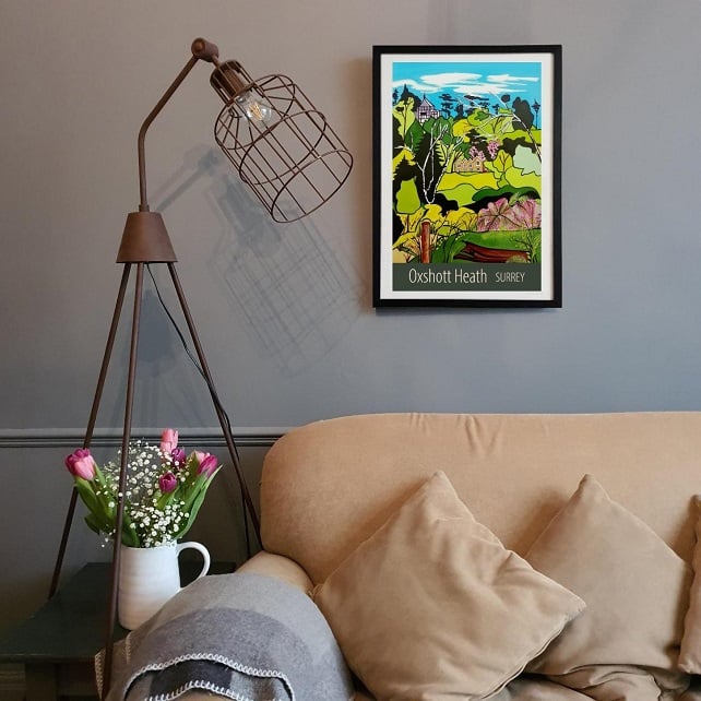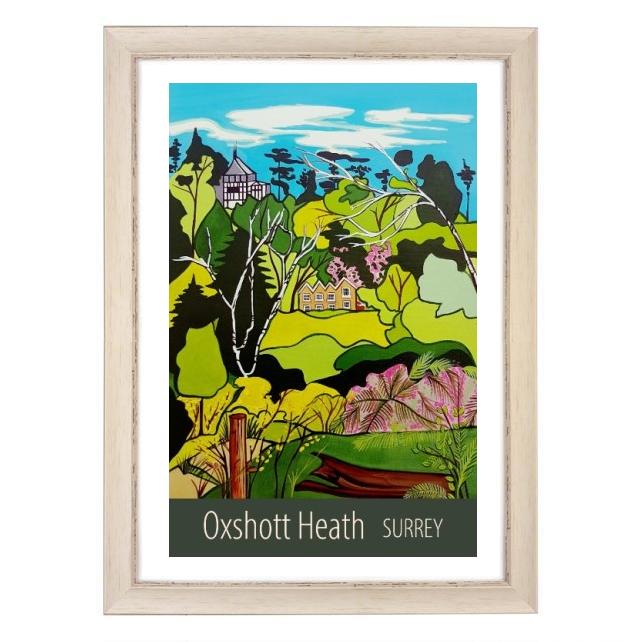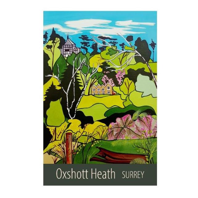 A contemporary travel poster style print of Oxshott Heath, a wonderful little spot in Surrey, from my own original acrylic painting.