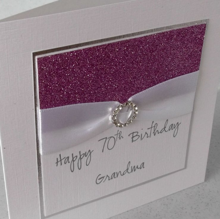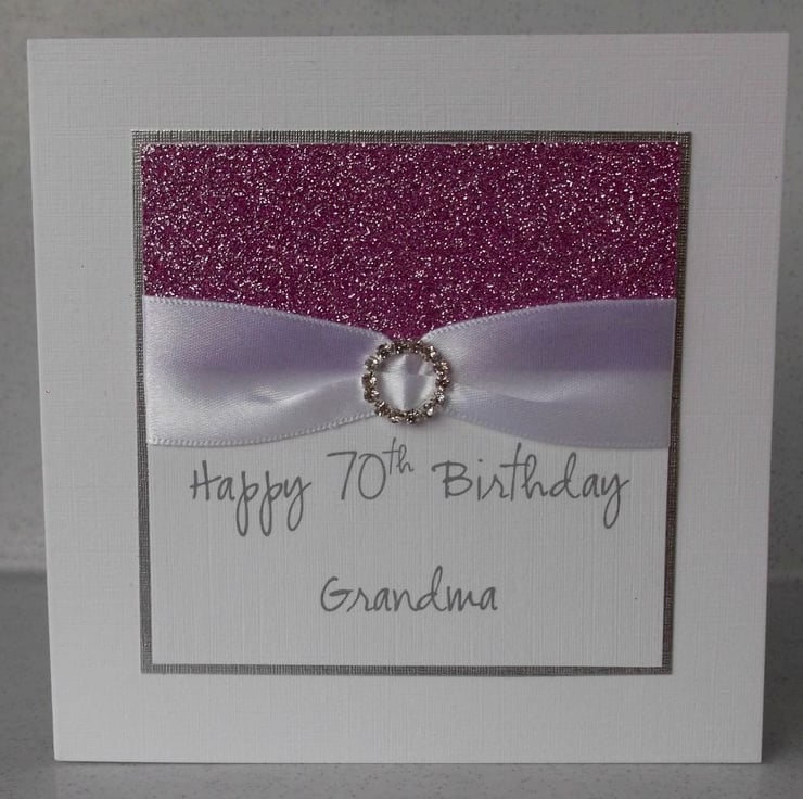This is a unique handmade designer birthday card, with a clean and simple design. A high quality, white card base with a panel of coloured glimmer paper, white ribbon and diamante buckle. You can personalise this card with any message for any age, name/relation and if needed, a date too. You can also choose a colour for the glitter panel from the options given.