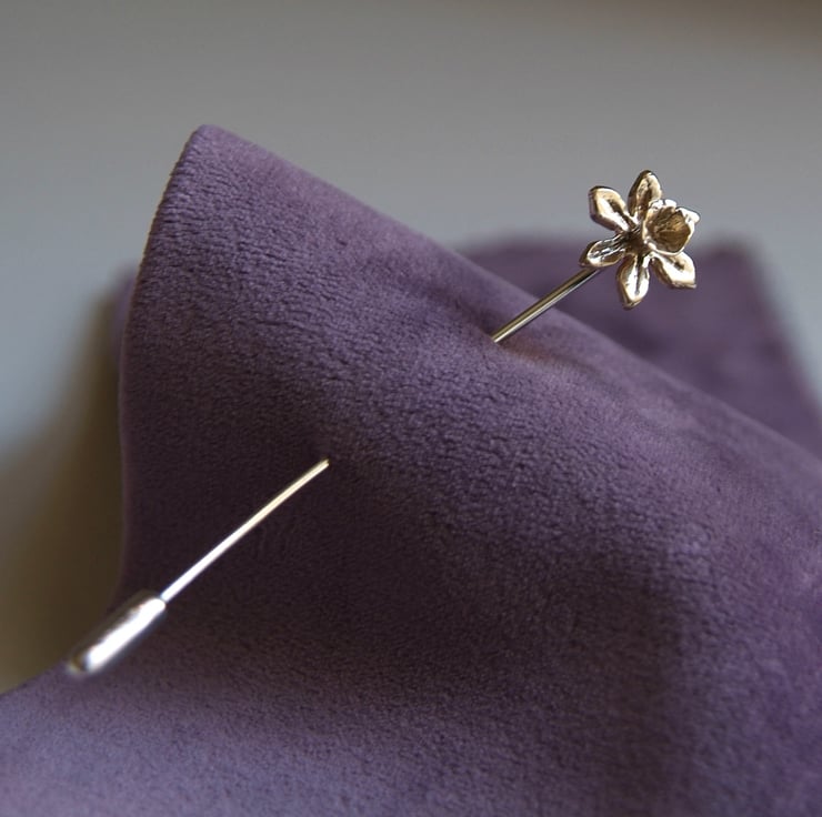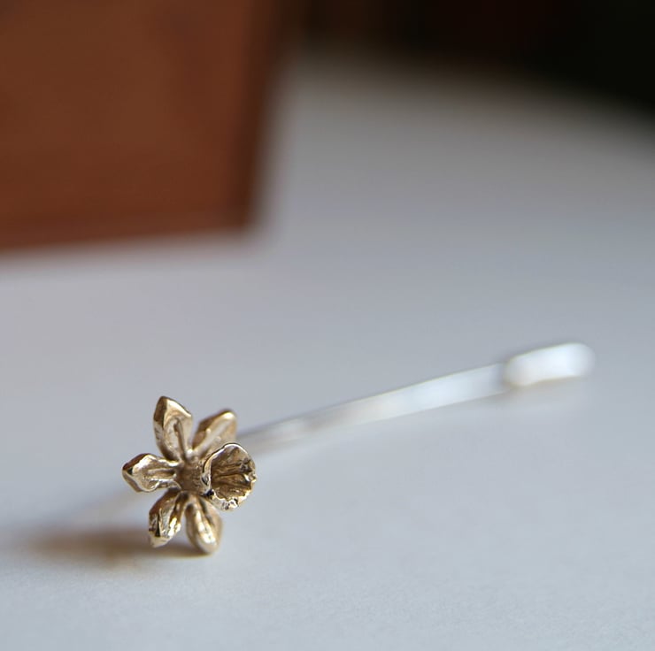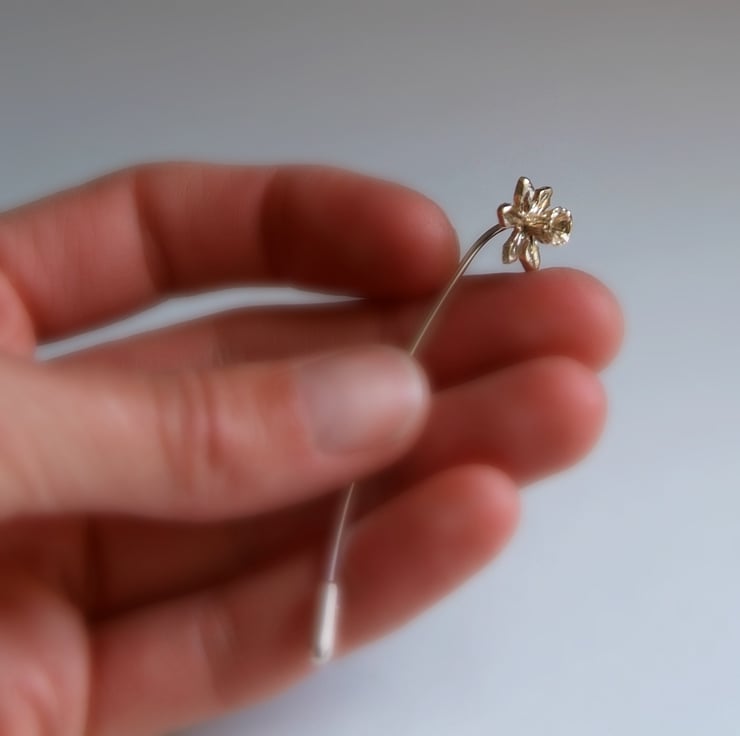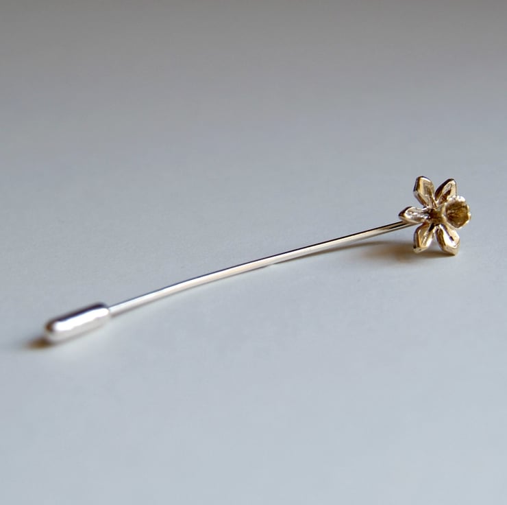 This daffodil pin brooch is handmade in silver & 9ct yellow gold.
