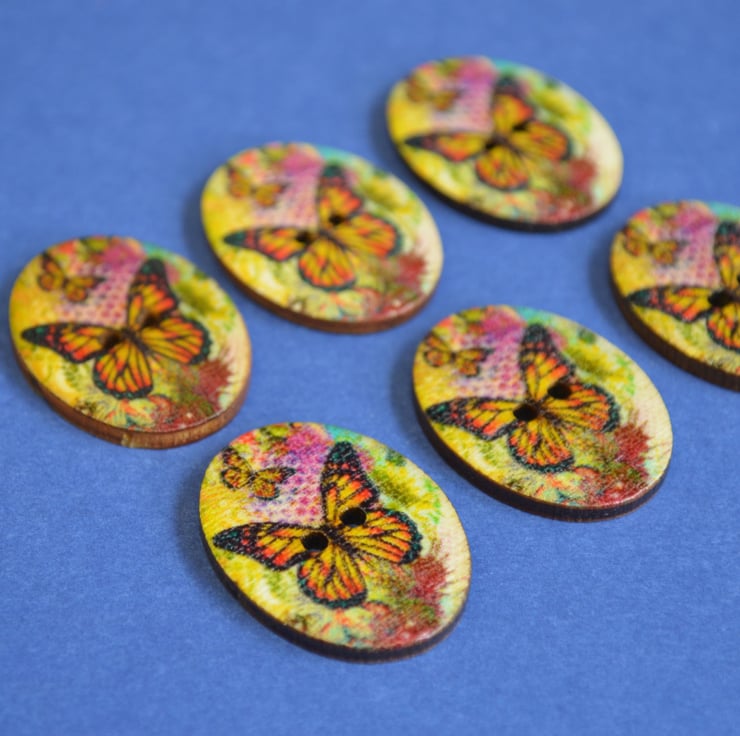 Wooden Oval Butterfly Buttons Colourful Flowers Yellow 6pk 30x22mm (OB6