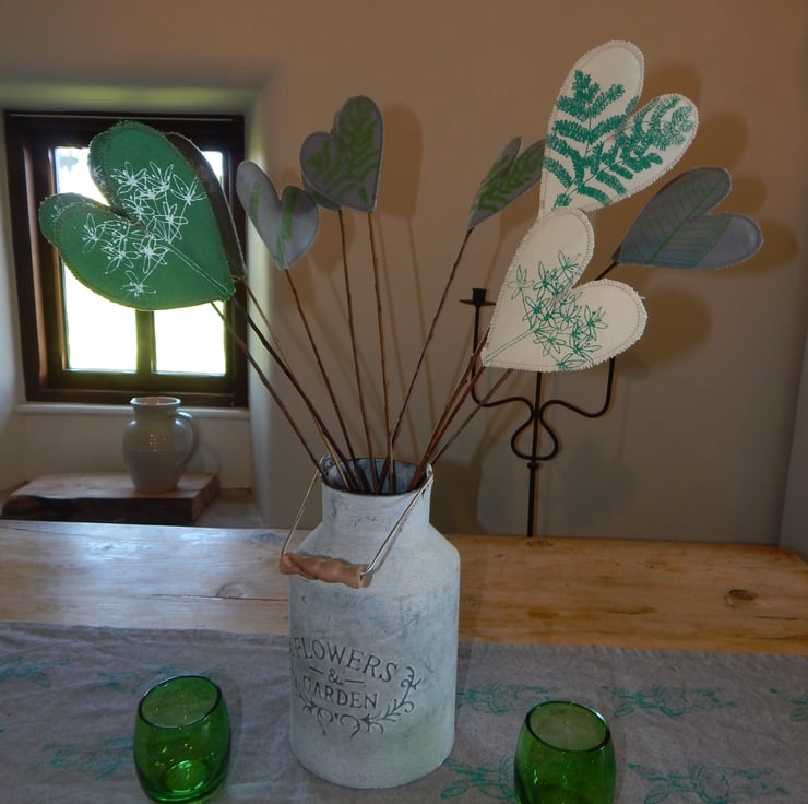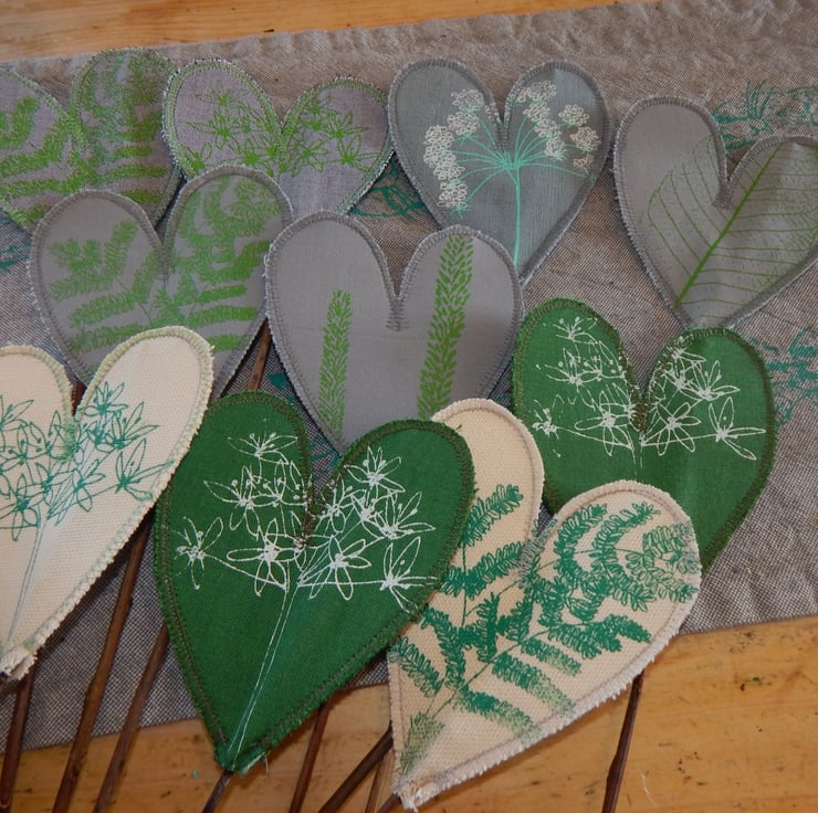 These are 10 screen printed hearts on willow. They are double sided and have bracken, achillea, wild garlic, leaf vein pattern and wild grasses screen printed onto them. Each heart has 2 layers of interfacing to stiffen the fabric and the heart has running stitch then a zig zag around the edges to minimise fraying.