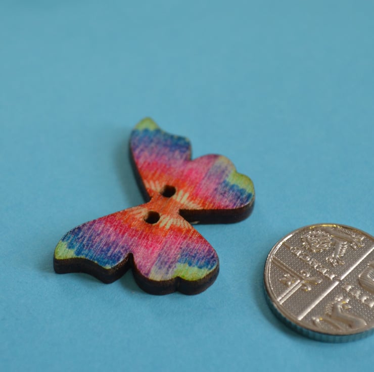 Wooden Butterfly Buttons Rainbow Pink Turquoise Blue 6pk 28x20mm (B14)
