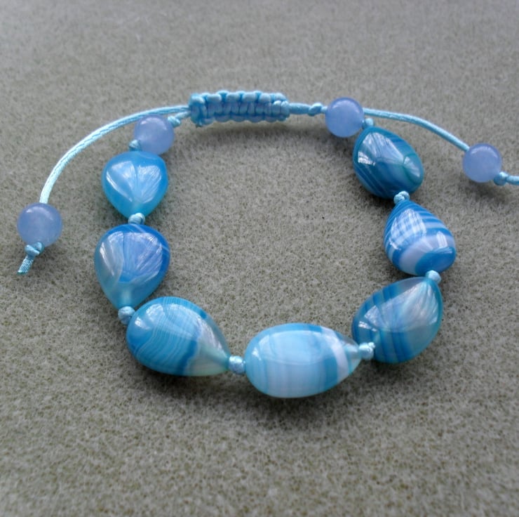 Blue striped agate pear shaped beads and round dyed quartz beads are knotted onto a blue satin cord