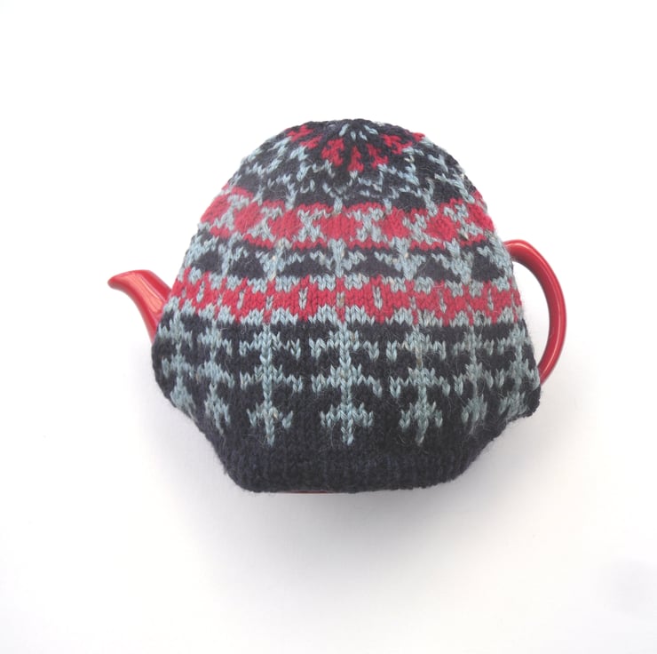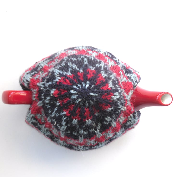 Fair isle Tea Pot Cosy , hand knitted in acrylic / wool mix yarn with 2 openings for the handle and spout.