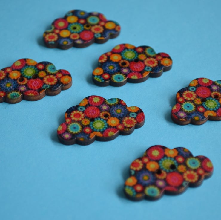 Wooden Cloud Buttons Multi Coloured Black Orange Blue Red 6pk 30x20mm (CD4)