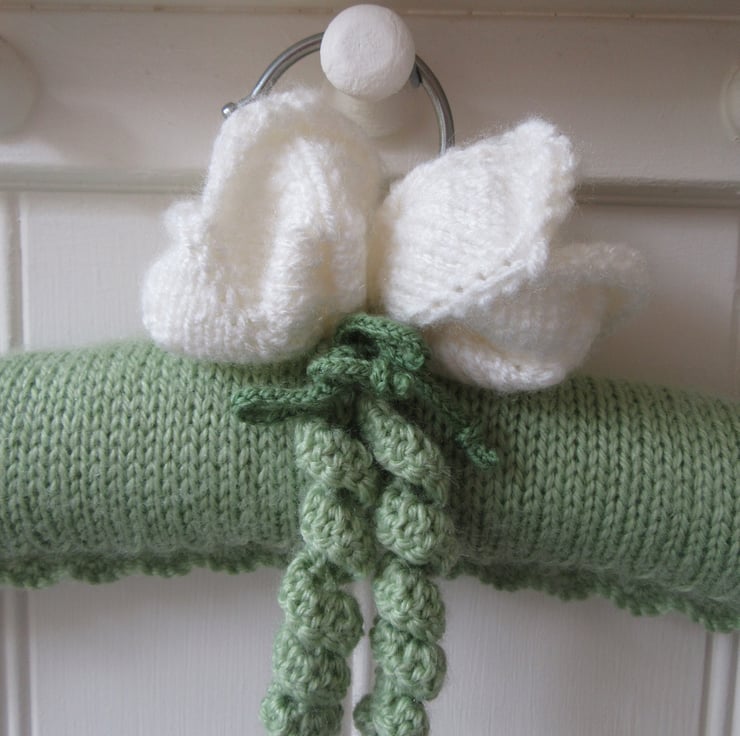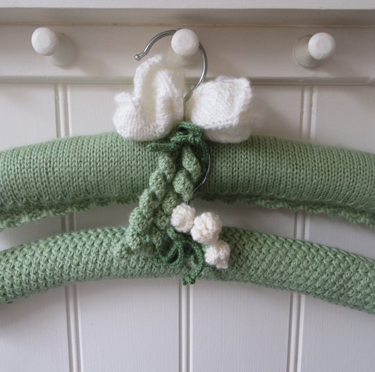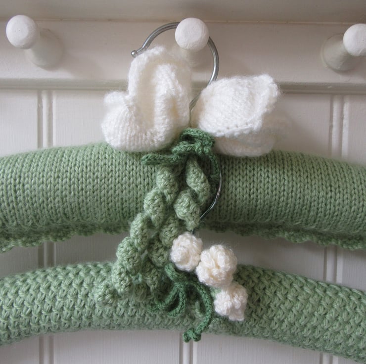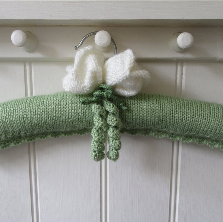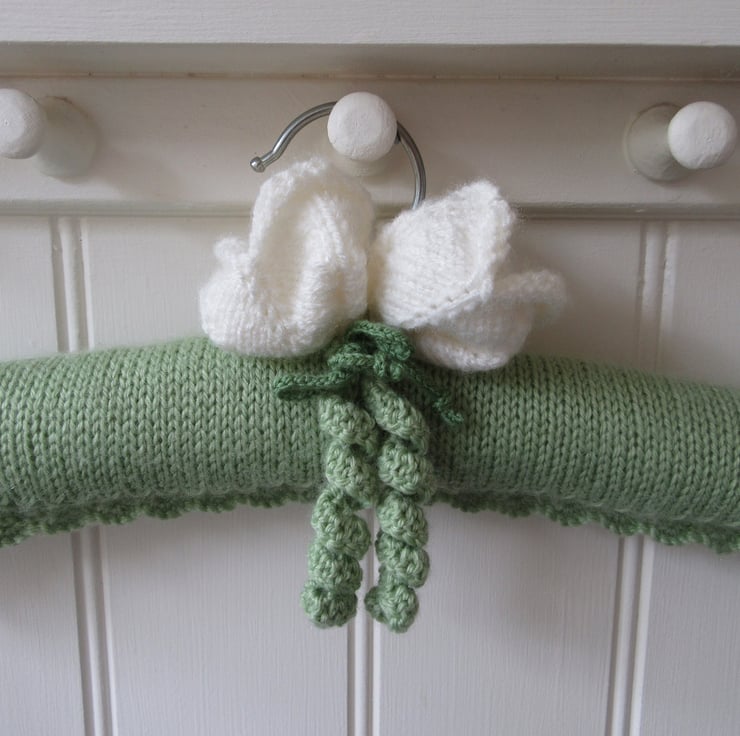 A beautifully hand knitted ladies coat hanger with white tulips.