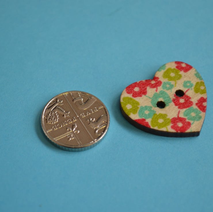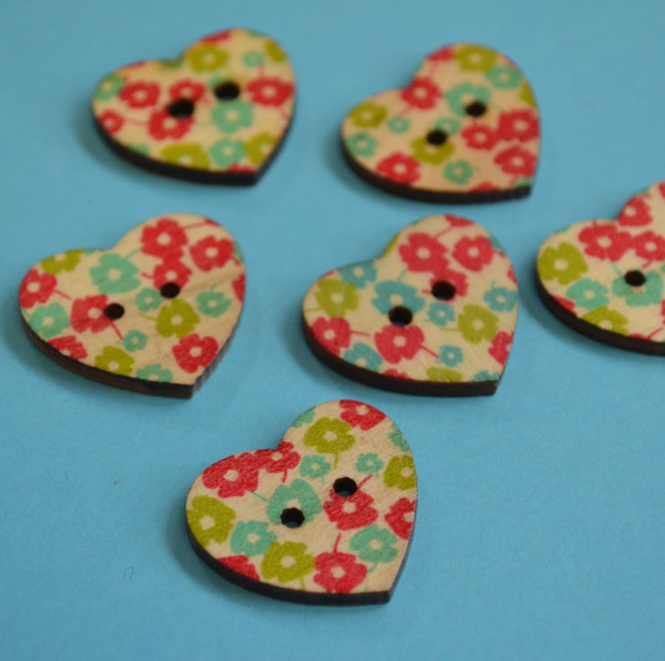 Wooden Heart Buttons Floral Retro Daisy Green Red Blue 6pk 25x22mm (H15)