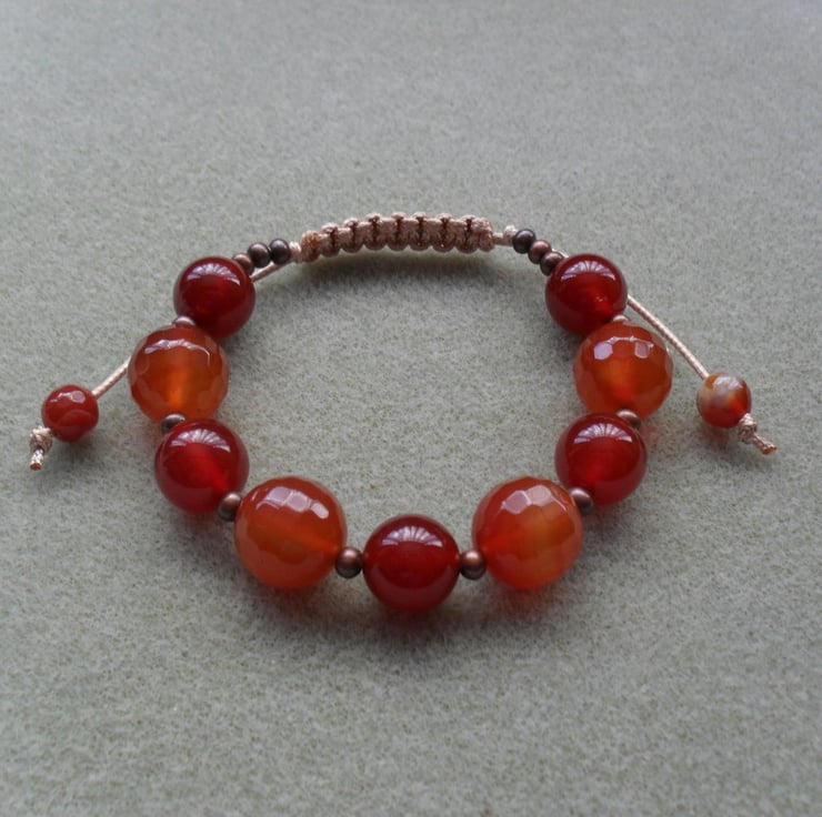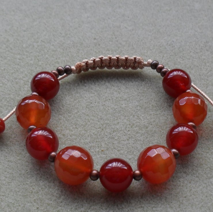 14 mm faceted burnt orange agate and 12 mm agate with small copper coloured brass spacer beads are knotted with a beige cord