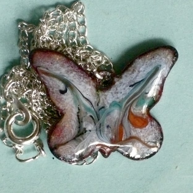 This butterfly measures 23mm by 19mm. It is mounted on a 45cm silver plated curb chain that fastens with a simple bolt ring.