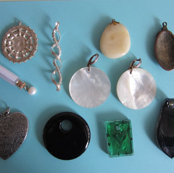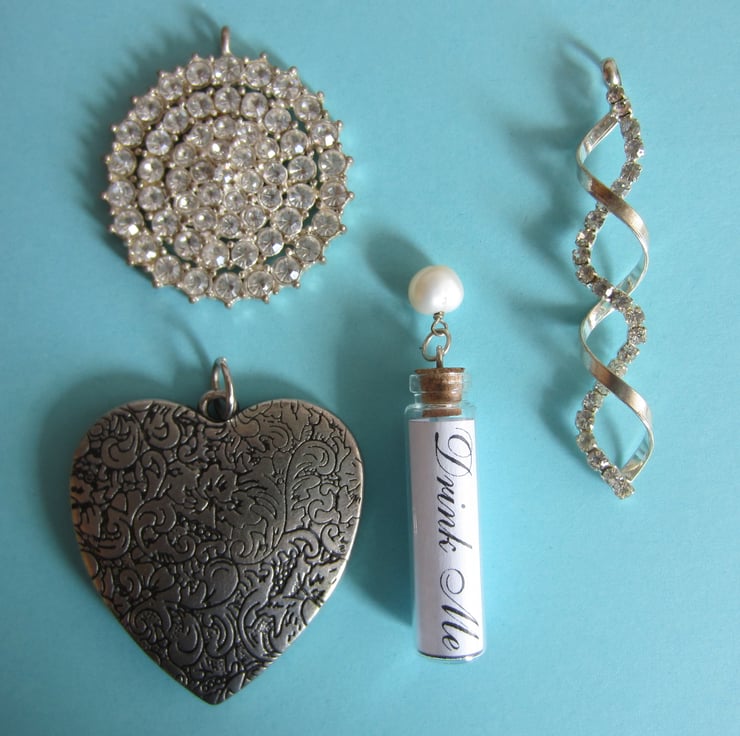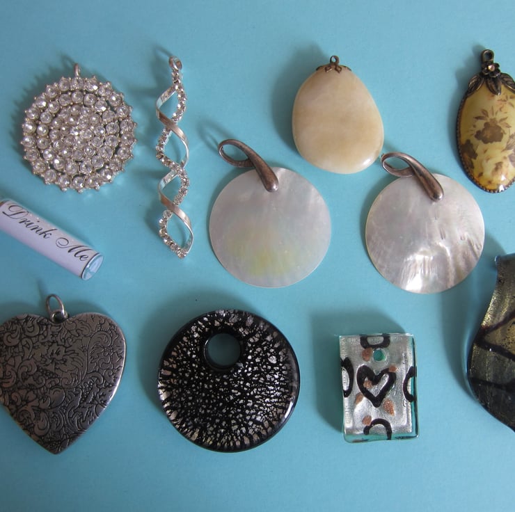 Nice lot of 11 assorted pendants for jewellery makers, ranging in size of 33 x 40 mm ( cream stone pendant) to 74 mm long (spiral diamante pendant) and 52 x 48 mm (silver tone heart).