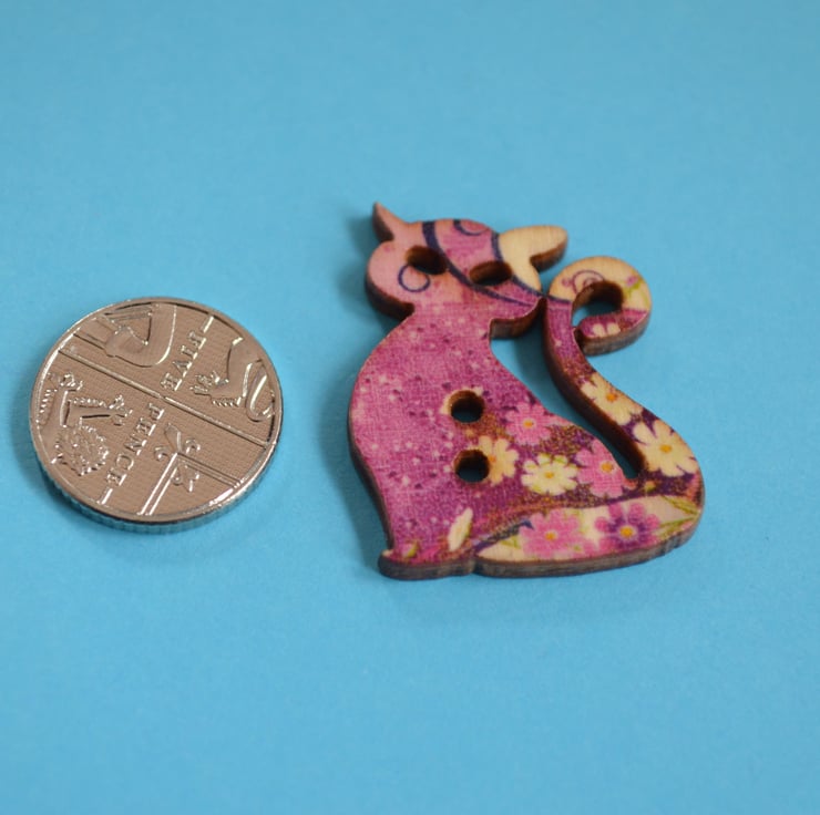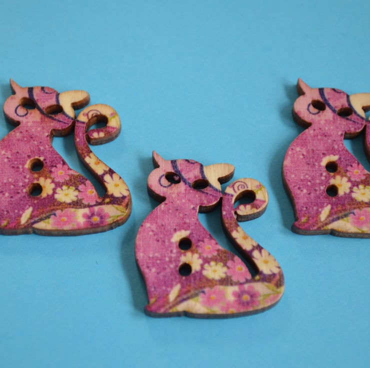 Wooden Cat Buttons Purple Yellow 3pk 30x25mm Kitty Pussy Kitten (CT3)