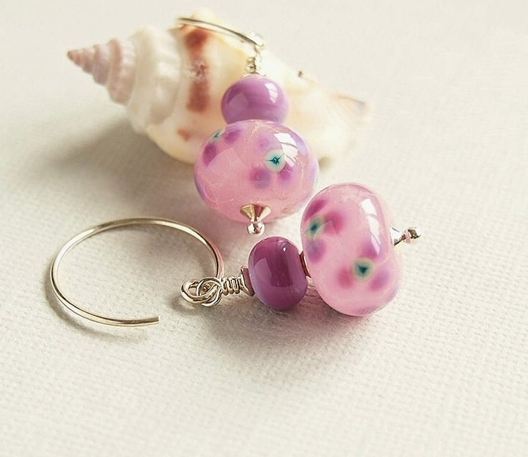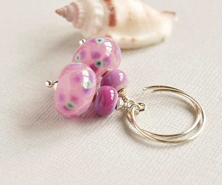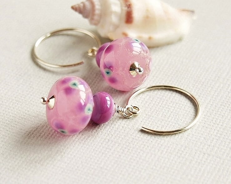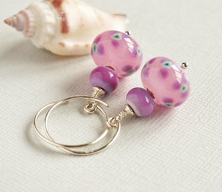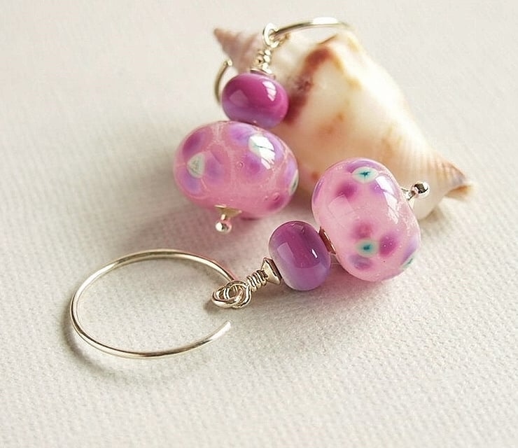 Beautiful handmade earrings featuring pink artisan lampwork glass beads by Irish glass artist Szilvia of Over The Glass Hill.