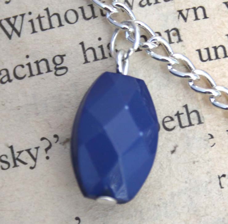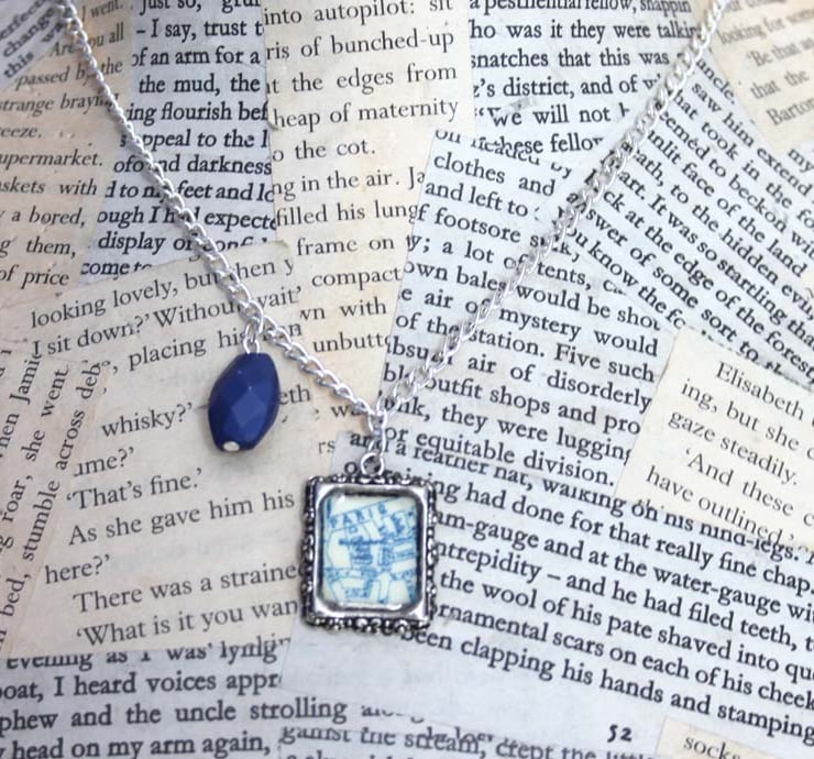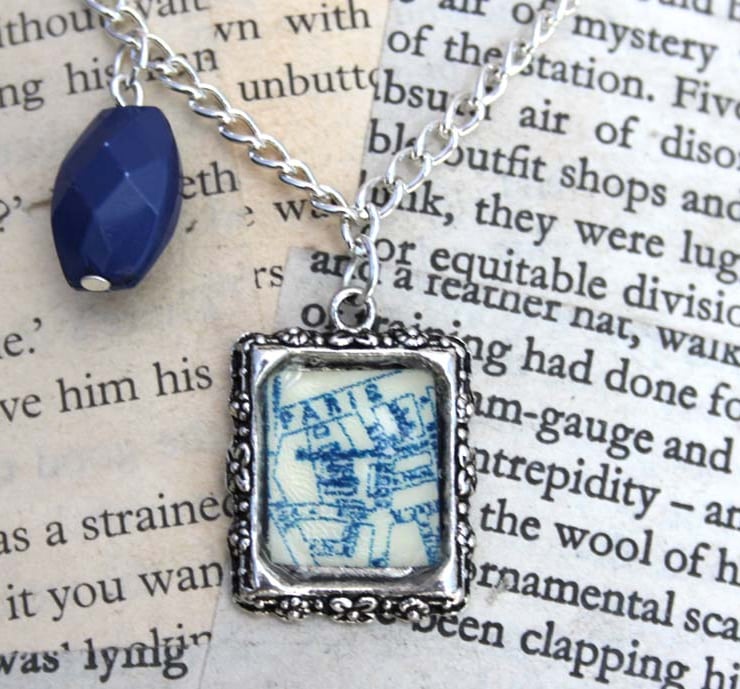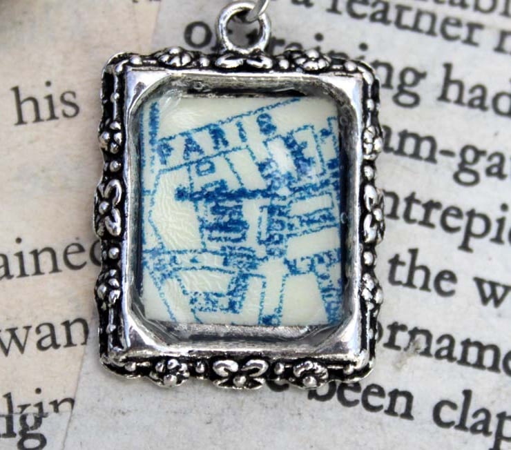 This cute charm necklace features a framed section of Paris map in a Tibetan silver frame charm. It hangs on a silver tone chain, with a faceted blue bead to bring out the blue tones of the map.