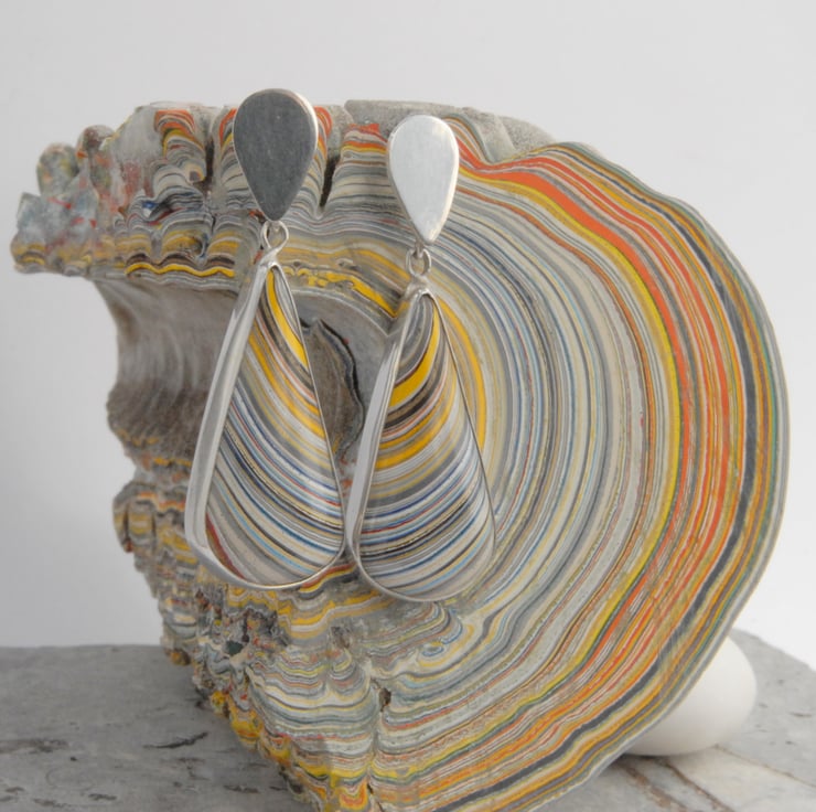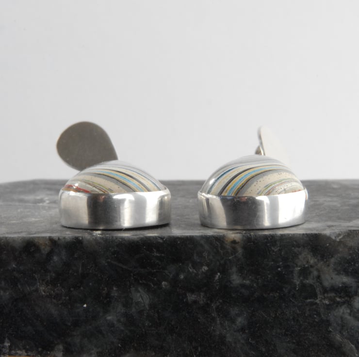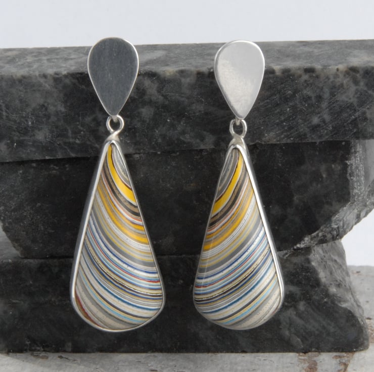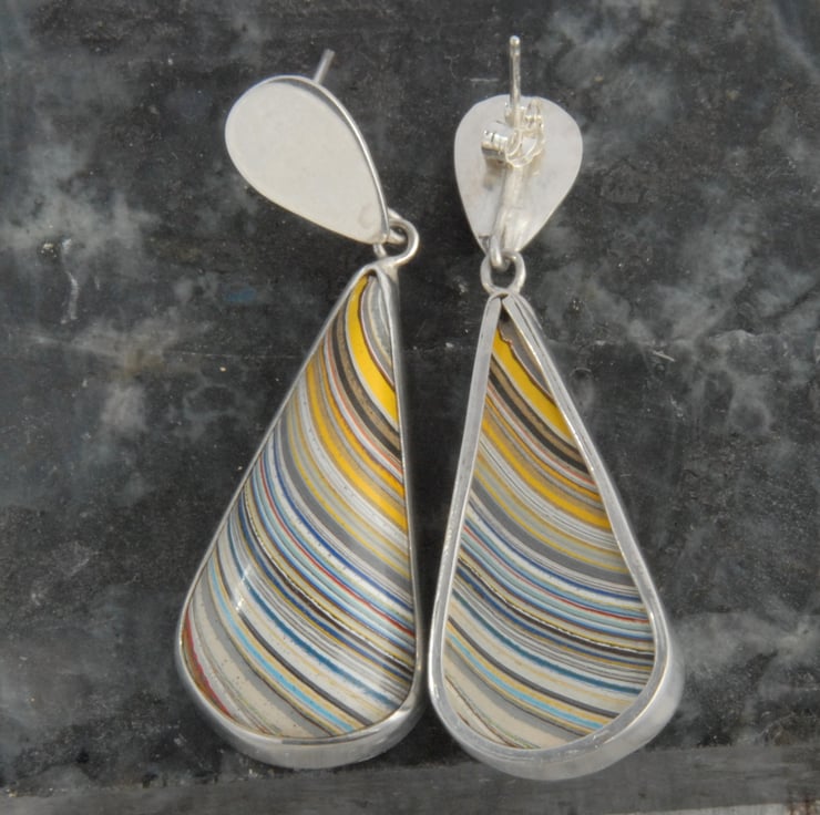 These stunning earrings feature matched drops of stripy fordite hanging beneath sterling silver stud tops. The fordite is banded with layers of blues, cream, yellow, beige and black - very pretty and would look good with any outfit. The earrings have open backed settings so they are interesting from all angles. Fordite is the ideal gift for anyone who loves cars or the unusual as it is layer upon layer of paint that built up in the old spray booths, I believe this material came from a van spray shop in Dagenham in the 1970's as it features slightly wider layers and a wealth of corporate colours (you can see the lump of rough in the main photo so ask someone who remembers the 70's to identify them if you don't). I cut and polish the fordite myself and wanted to do a mirror image pair of cabochons, they are not quite an exact match (as I found out whilst making the settings) but are so attractive I didn't want to sand them any more. I have more of the rough so if you would like a different shaped earrings, cufflinks or a pendant to match then drop me a message I should be able to make you something extra special. Fordite is no longer produced due to changes in the way vehicles are sprayed.