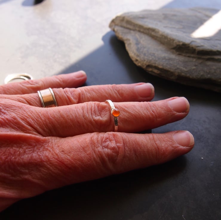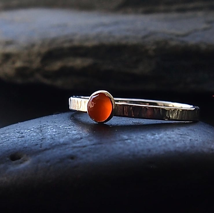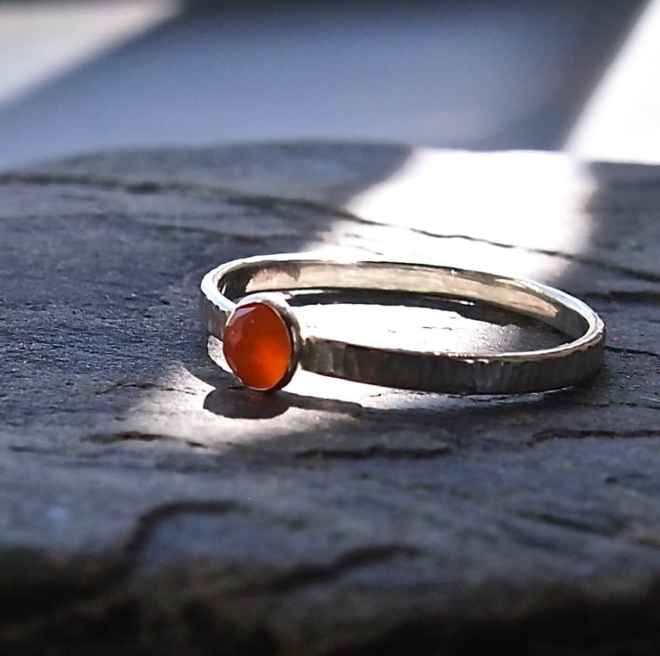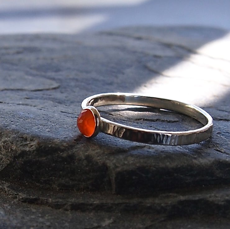 A textured 2mm sterling silver band has a beautiful 4mm facetted cabochon. This is a carnelian which is rose cut and is a subtle yellow orange.