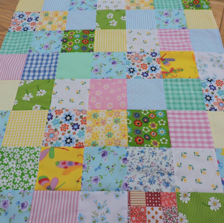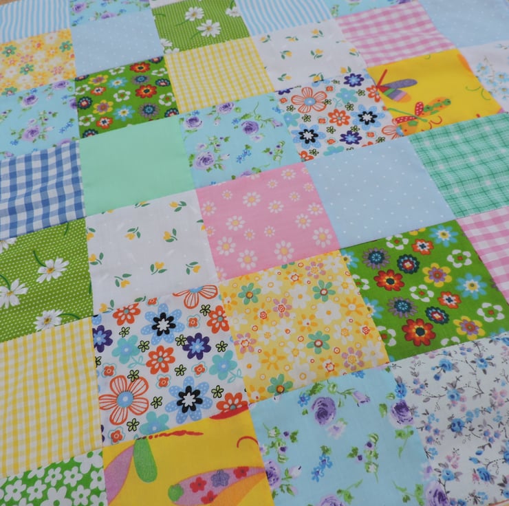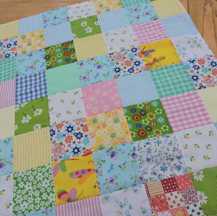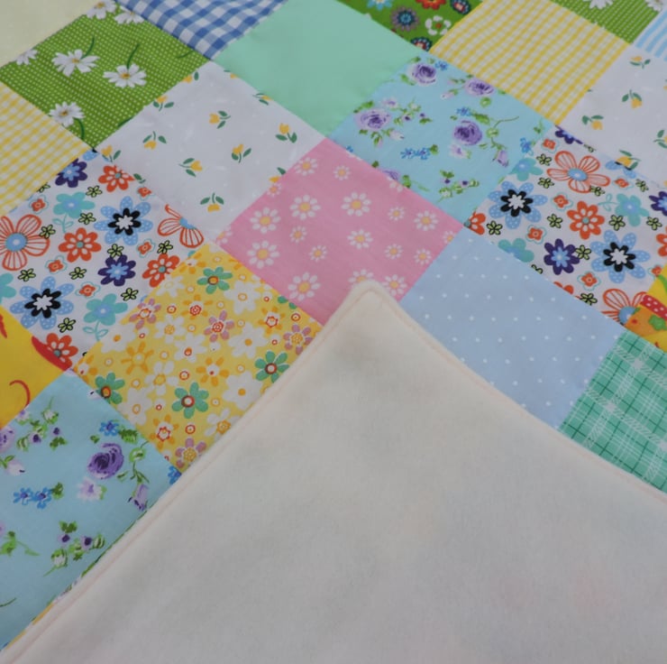 I've made this colourful patchwork baby throw with little squares of predominantly yellow, pink, green and blue poly cotton fabrics and an ivory fleece backing. No wadding. Making this an ideal summer throw for baby.