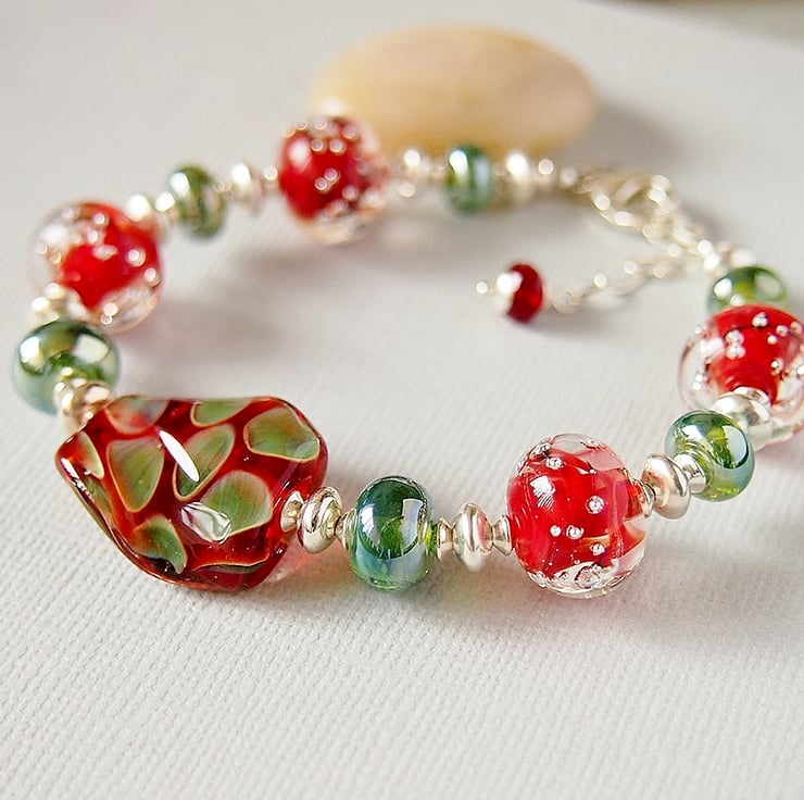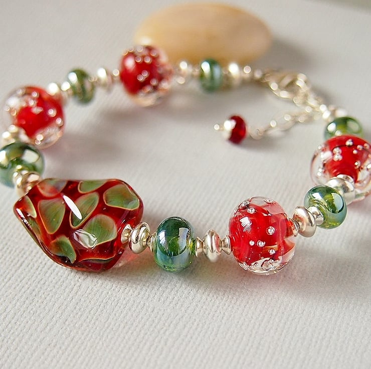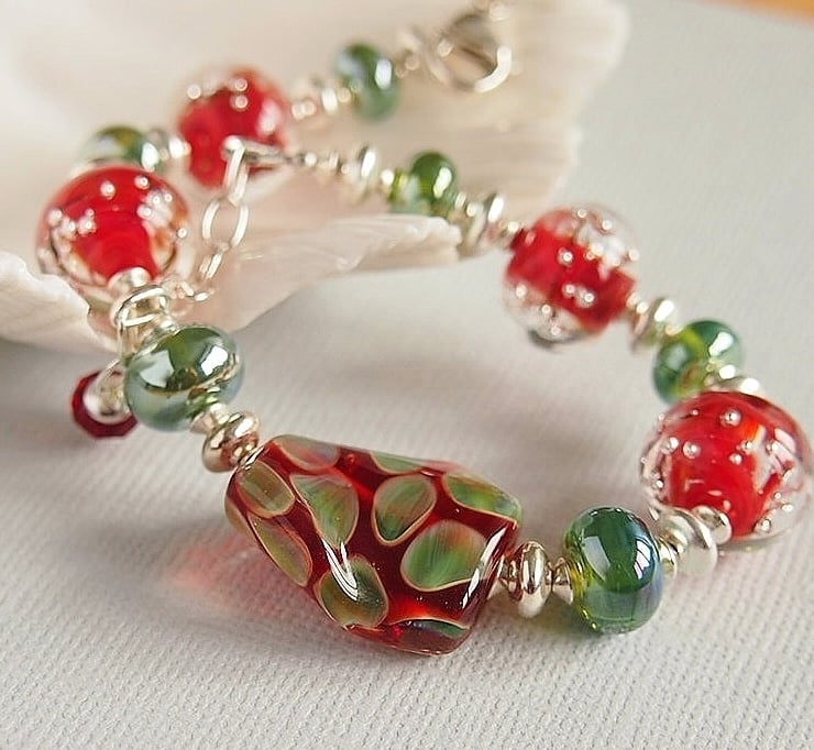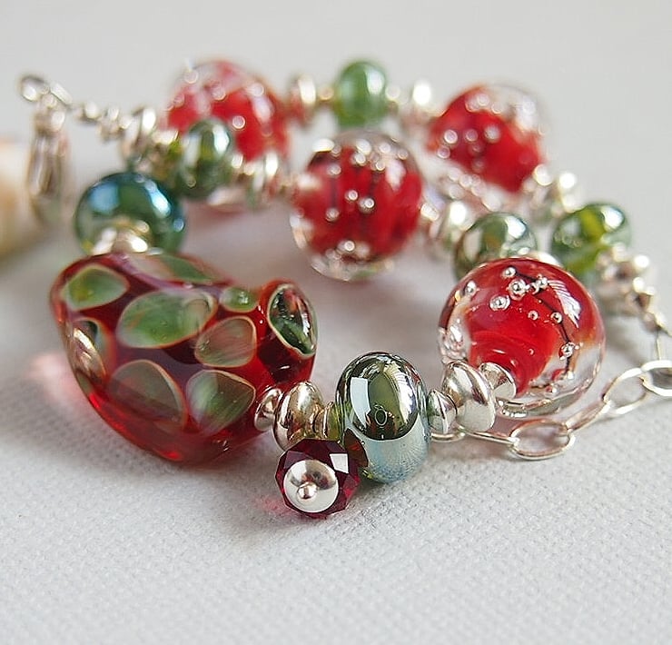 Stunning one of a kind bracelet featuring beautiful lampwork beads in red and green handmade by glass artisans from the USA and UK.