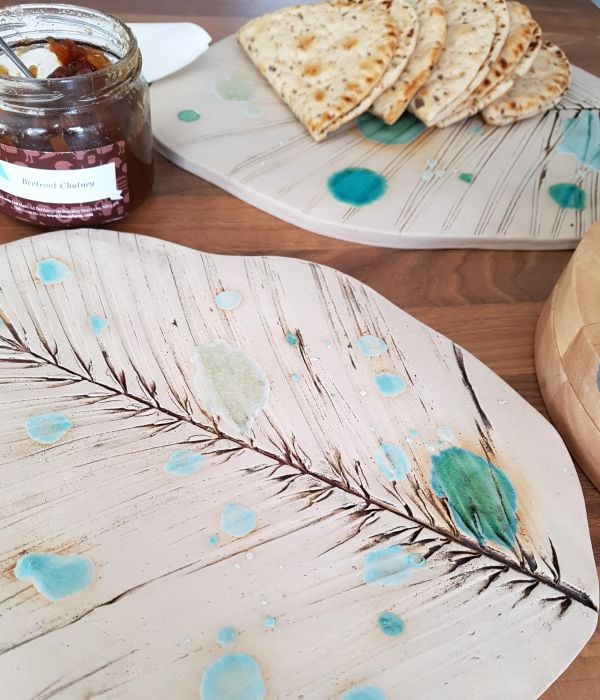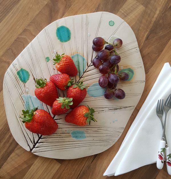 Approx 30cm long, these handmade ceramic platters have a real leaf impressed into the surface. Each platter is completely unique in shape and surface decoration, making each one a one-off piece. No two are ever the same.
