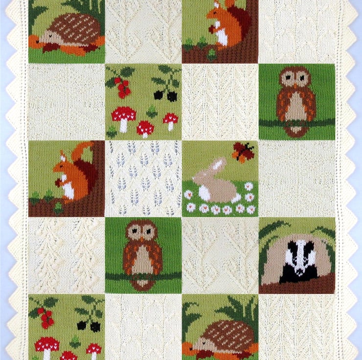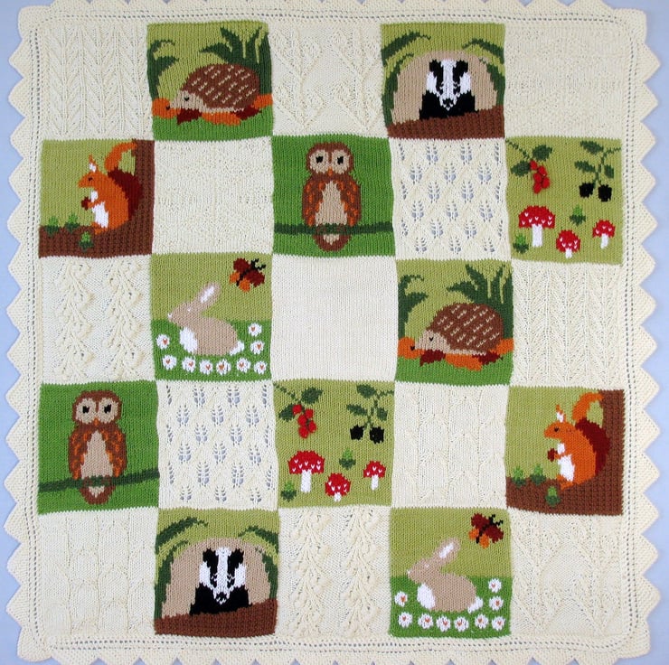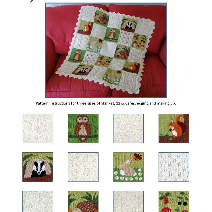 The pattern is written as colour charts and written instructions in standard UK knitting terminology. There are 6 one shade squares, each with a different pattern and 6 "picture" squares. They are knitted from bottom to top in strips then sewn together vertically. The edging is knitted separately and sewn on. I usually back the small blanket with quilting, there are instructions in the pattern for how to do this. You will need to know how to follow a chart and be able to do intarsia and fair isle (stranding) to knit this pattern.