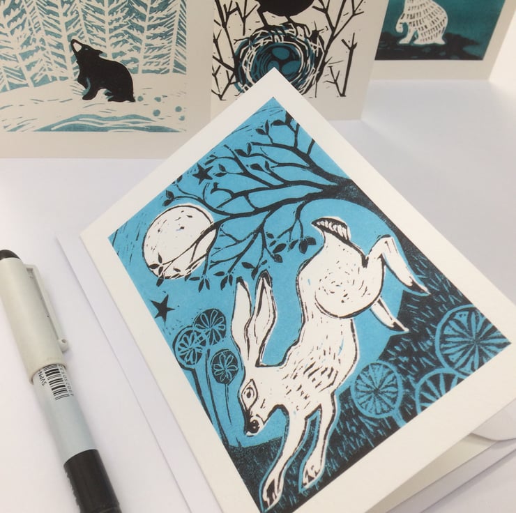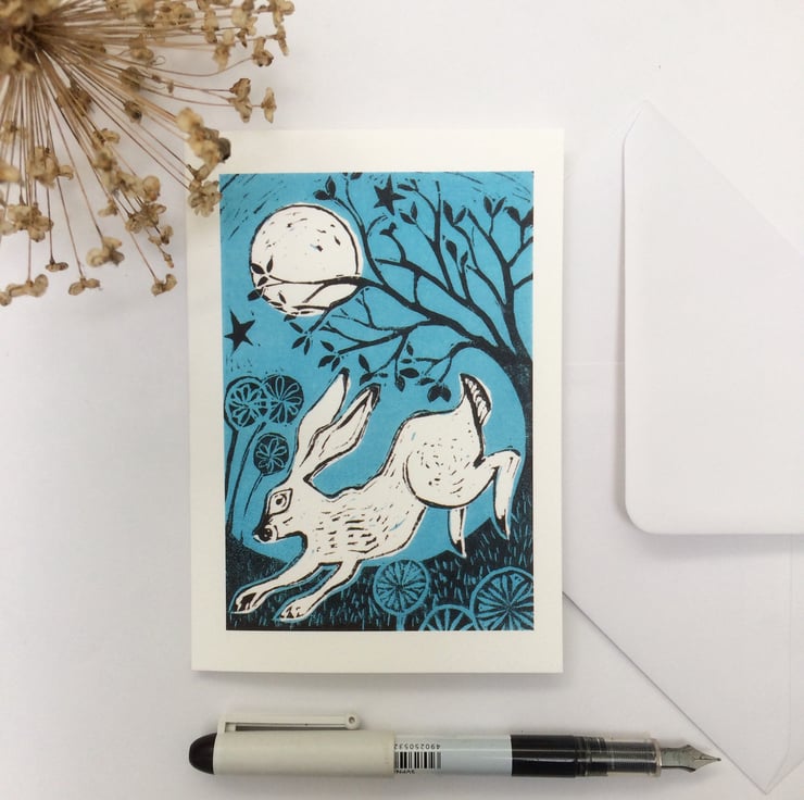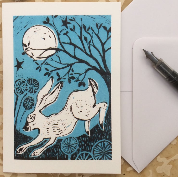A lovely card for many occasions including birthdays and thank yous, the design is based on an original Lino print also available. Printed on recycled card with matching white envelope. Sent bounding along in first class post.