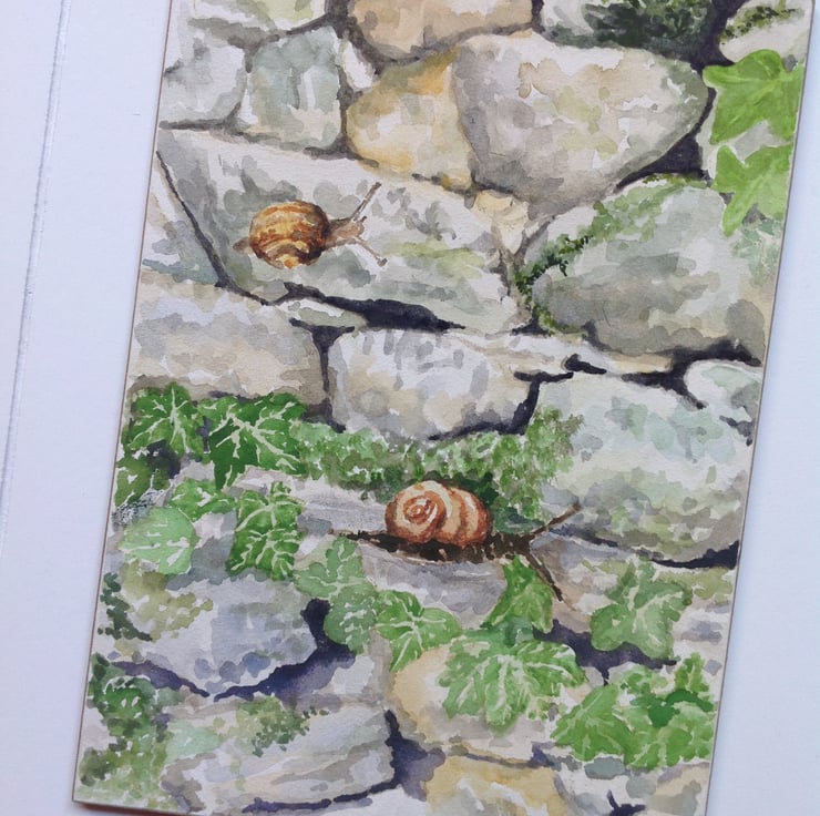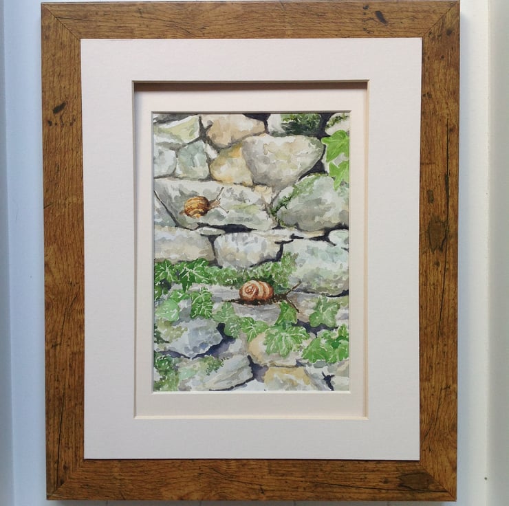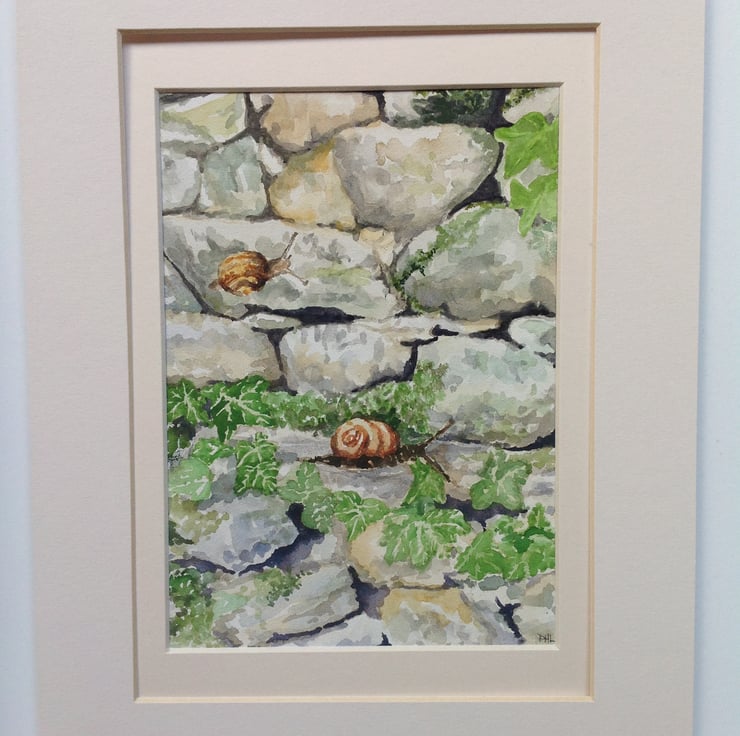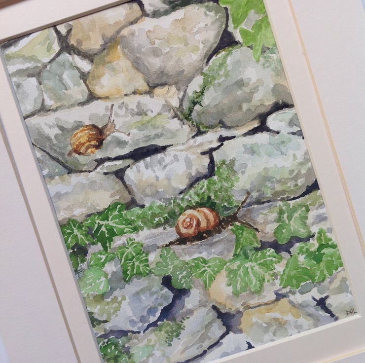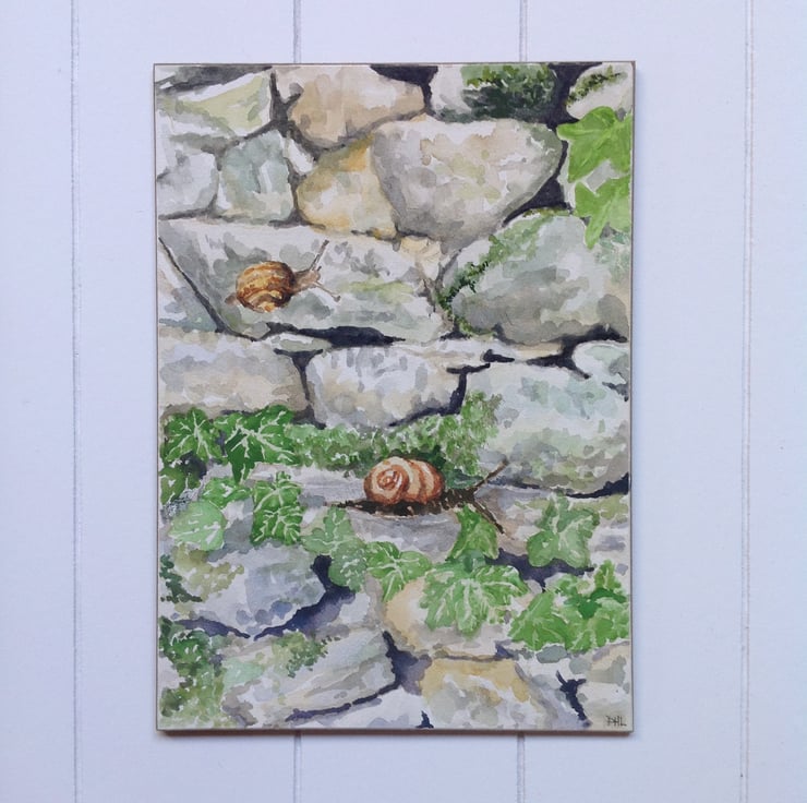 An original, unique painting of two snails on a dry stone wall in the Lake District. Inspired by a moss and ivy covered wall on the shores of Lake Windermere.