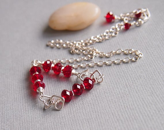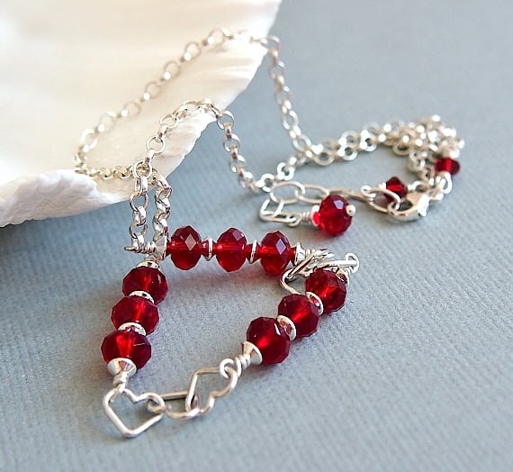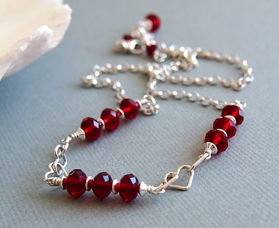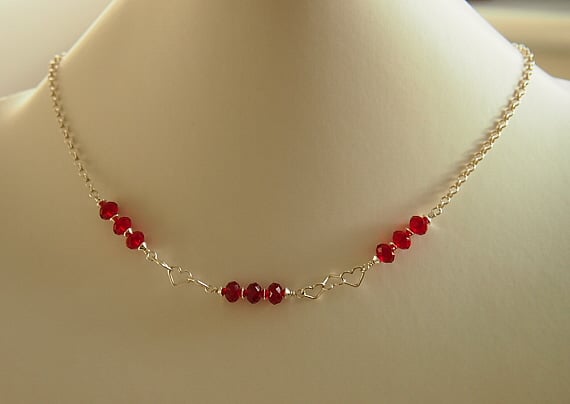 Handmade necklace featuring Swarovski 6mm crystal rondelles wired to quality weight sterling silver chain accented with sections of sterling silver heart chain.
