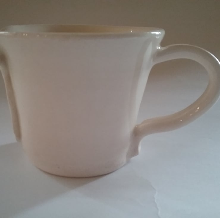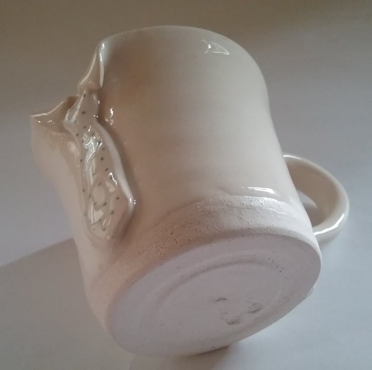 Quirky tie detailed hand thrown and altered ceramic mug in a white clay.