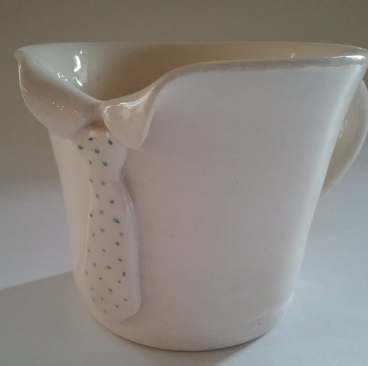 The tie has hand-painted blue spots and the collar appears to grow out of the mug. The clear glaze over the white clay gives a warm off-white colour.