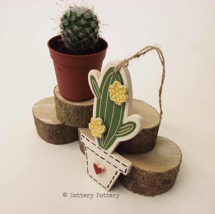 This cute little cactus is made from white earthenware clay and decorated with a black stitching design and a little red heart.