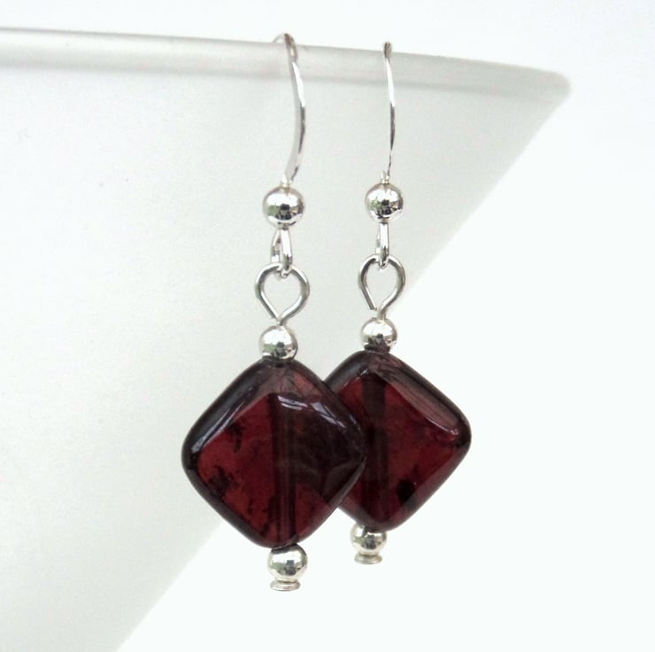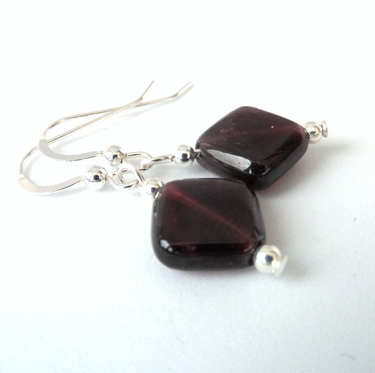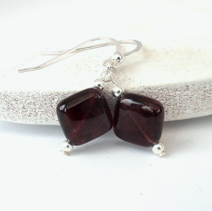 Diamond shaped garnets hang with little sterling silver beads from sterling silver earwires in these beautiful earrings.