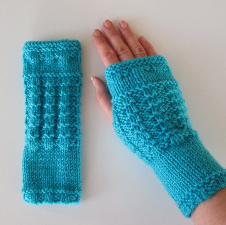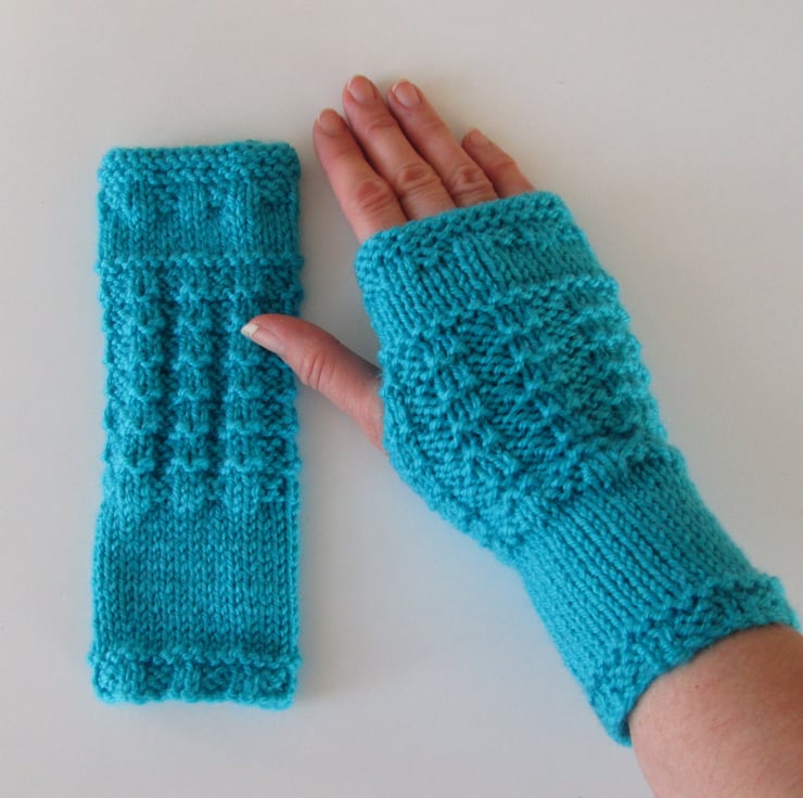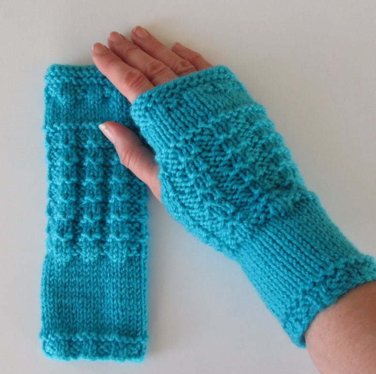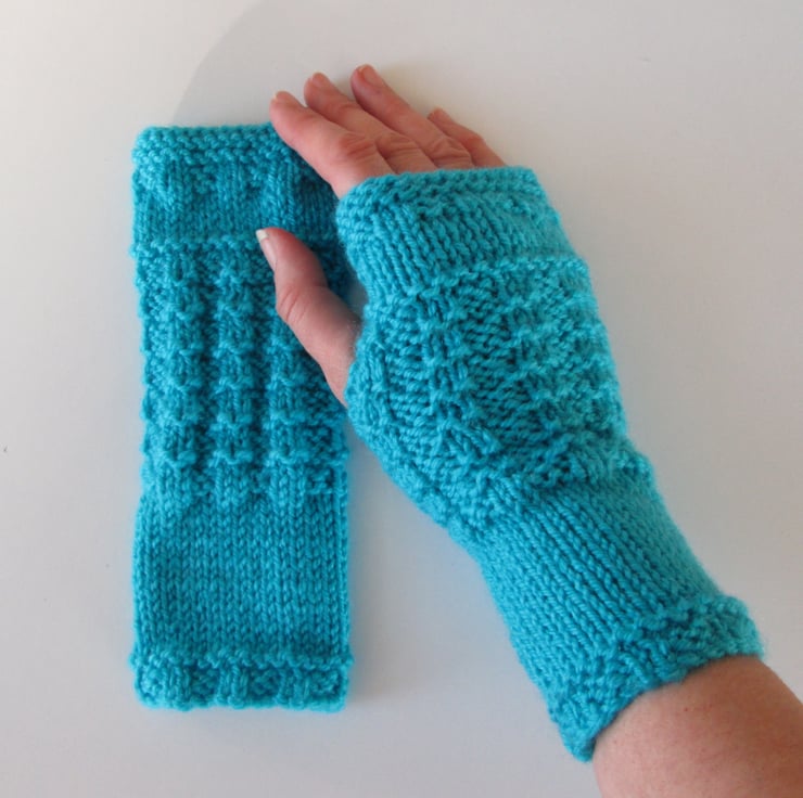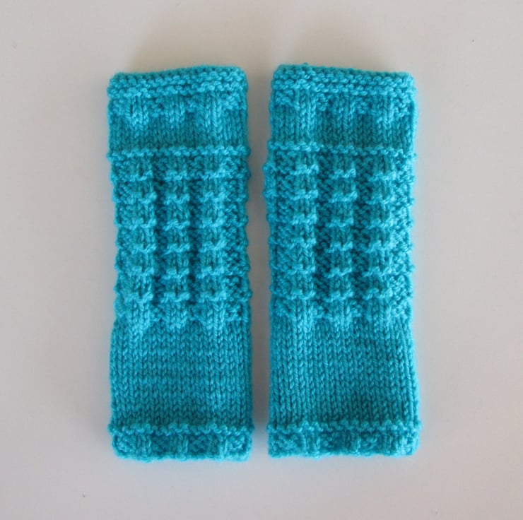 These turquoise cosy fingerless gloves / mittens / wrist warmers are knitted with a pretty waffle pattern. They are made from 25% Aran wool and are 8 inches long.