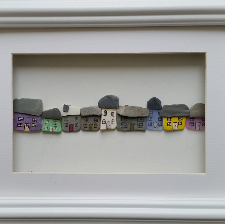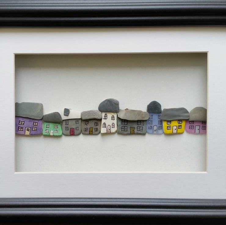 A quirky village street created from pieces of beach combed pottery, sea glass and stone set inside a 26cm x 35cm glazed box frame that is available in either black or white - just state your preference when you place your order.