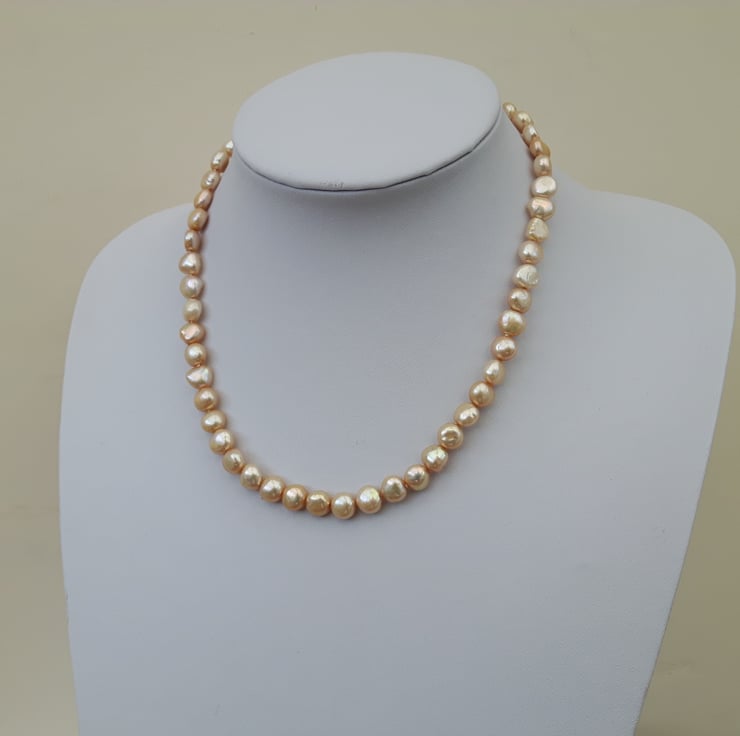 This sterling silver and freshwater pearl necklace comes in a lovely warm shade of gold. It would make a perfect gift or wed8ding accessory. The pearls are slightly flattened rounds with natural irregularities which give them individual character. The sweet little heart clasp is a pretty feature that could be worn at the front or side of the necklace as an alternative to the back. The overall length is 17.5in/44cm and there are 53 beads, each about 8mm in diameter. They are threaded on natural coloured pearl silk which does not stretch and has been hand knotted between the pearls for added security. The clasp is stamped 925 for sterling silver. The necklace will be packaged in a gift box and sent by Royal Mail first class post.