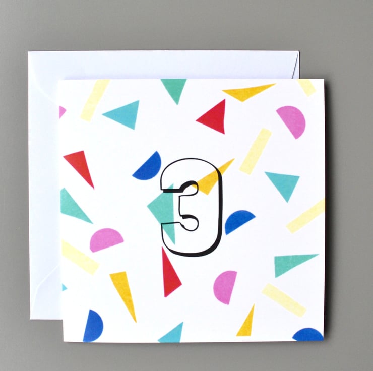 Kid's age birthday card with a cheerful confetti pattern of multi coloured shapes on a crisp white background. Age in black text in the centre of the card.