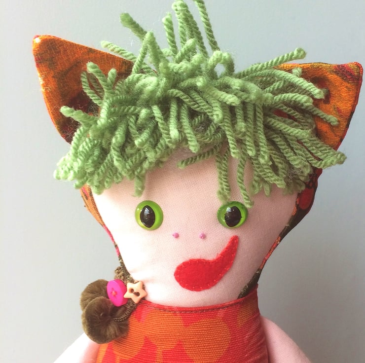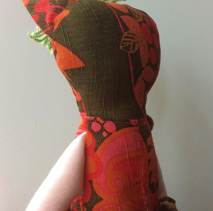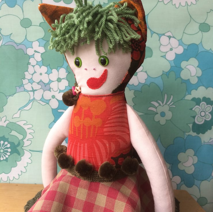 ECO - whilst some parts are new eg eyes and stuffing many of the fabrics are vintage and upcycled. also where possible I try to reuse packaging so she MAY come in a reused shoe box if I have one available.