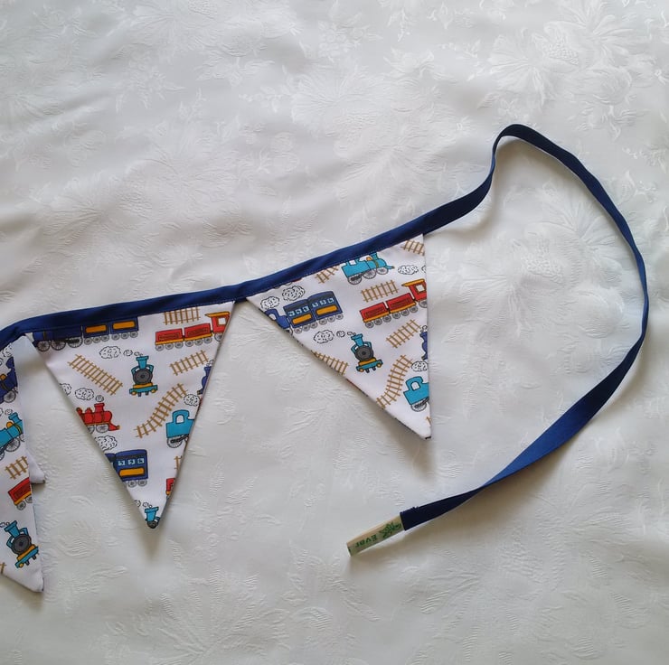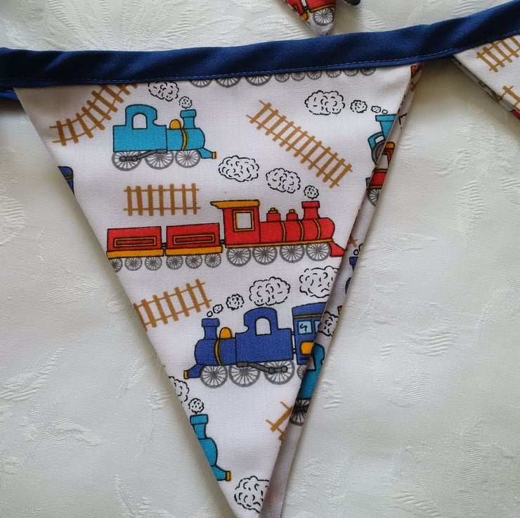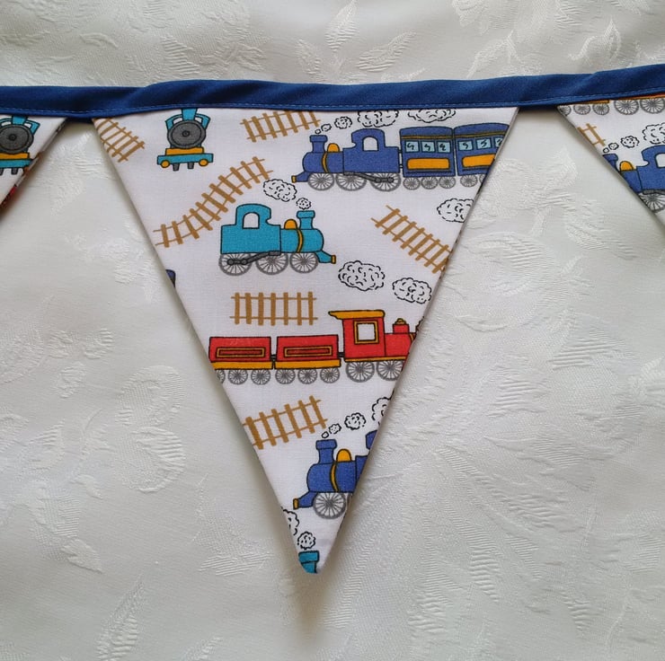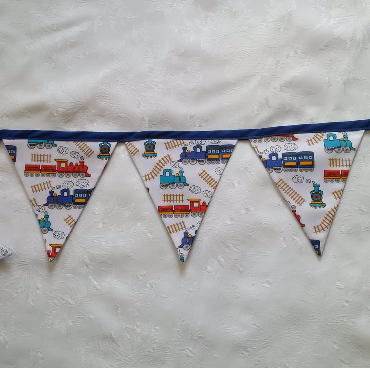 Bunting for a little boy. Made using a white poly cotton fabric with a multi coloured train design. Has a navy blue binding.
