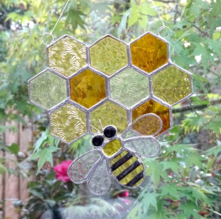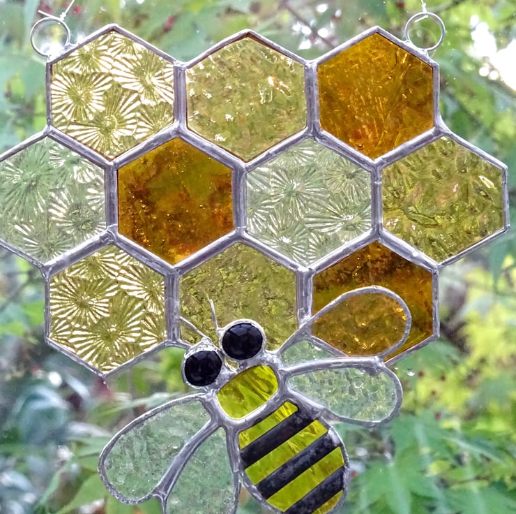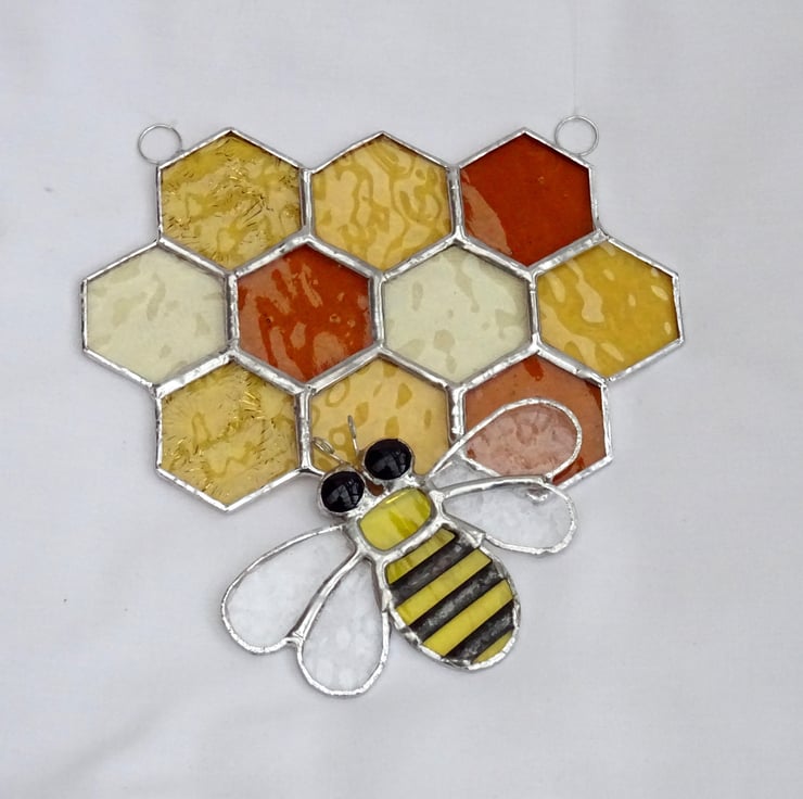 The honeycomb has been made from 10 hexagonal in five types of amber muffle, wissmach, sea glass and florentine glass. The bee has been made from yellow water glass and clear wissmach glass with black glass nuggets for the eyes. Each piece of glass has been copper foiled and soldered together, additional strips have been added to the bee and a patina applied to form the black stripes.