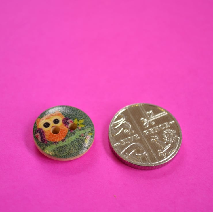 15mm Wooden Owl Buttons Purple Green Orange 10pk Bird (SOW4)