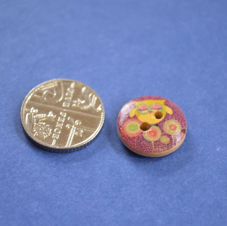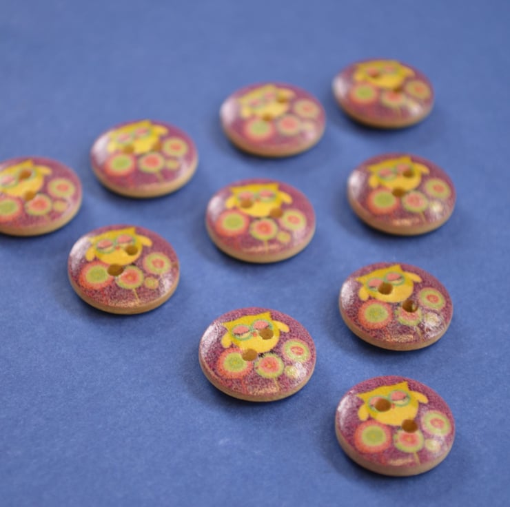 15mm Wooden Owl Buttons Purple Yellow Green Pink 10pk Bird (SOW9)