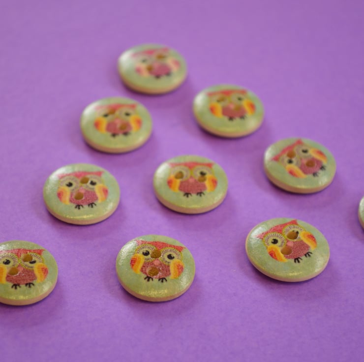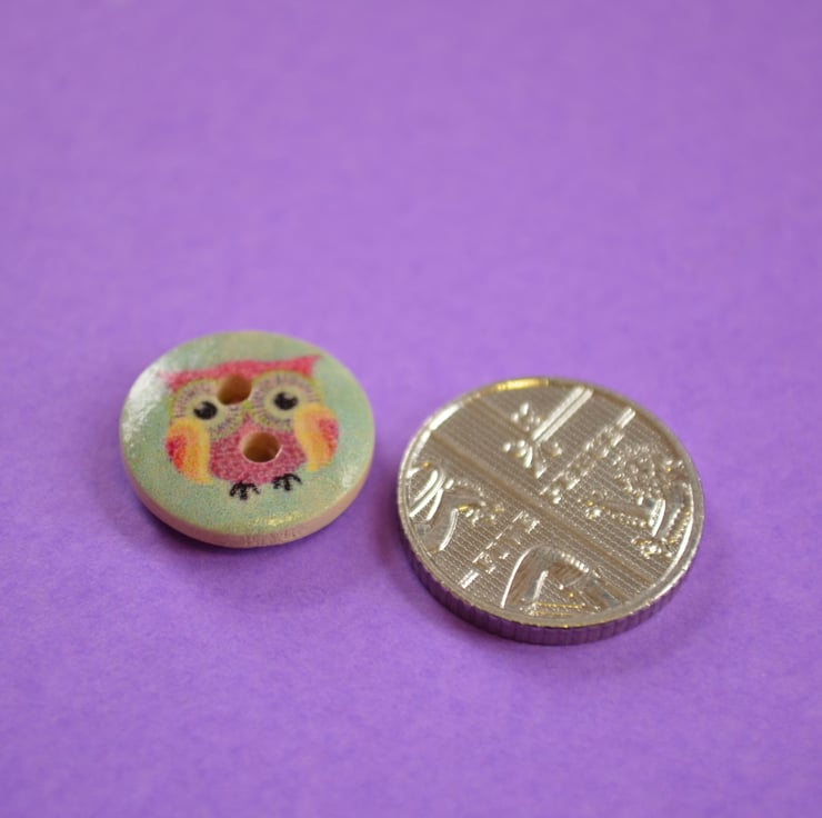 15mm Wooden Rainbow Owl Buttons Aqua Purple Yellow Pink 10pk Bird (SOW10)