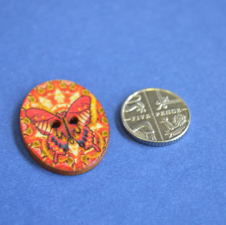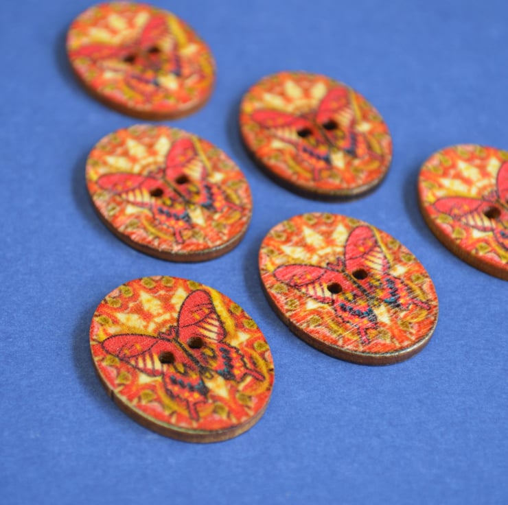 Wooden Oval Butterfly Buttons Colourful Kaleidoscope Red Orange 6pk 30x22mm (OB5