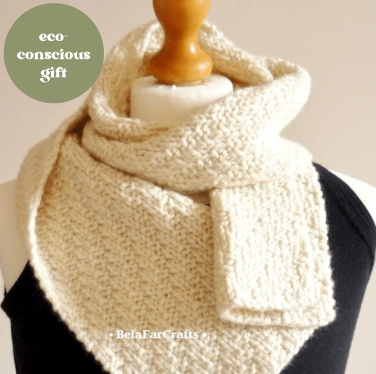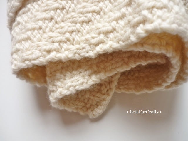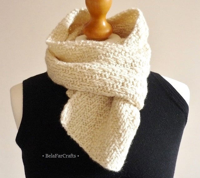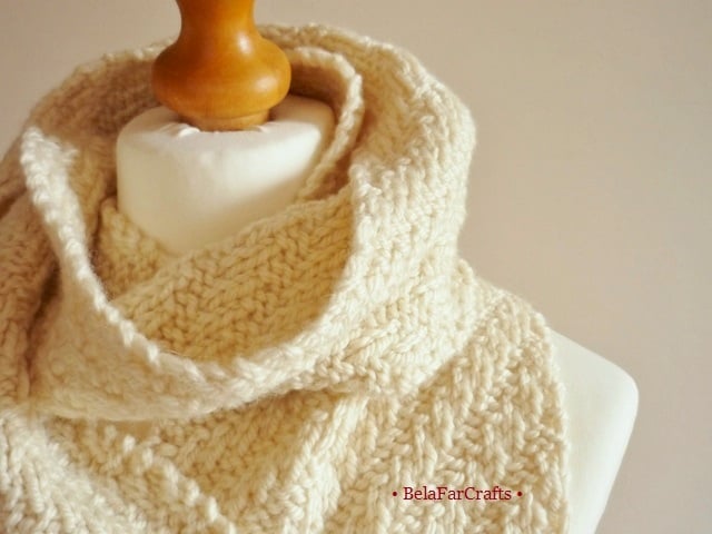 The colour is a neutral cream, perfect for men and women. I used a reversible pattern that adds some texture, making this scarf thick and warm. It measures about 16.5cm wide x 137cm (6.5in x 54in) long.