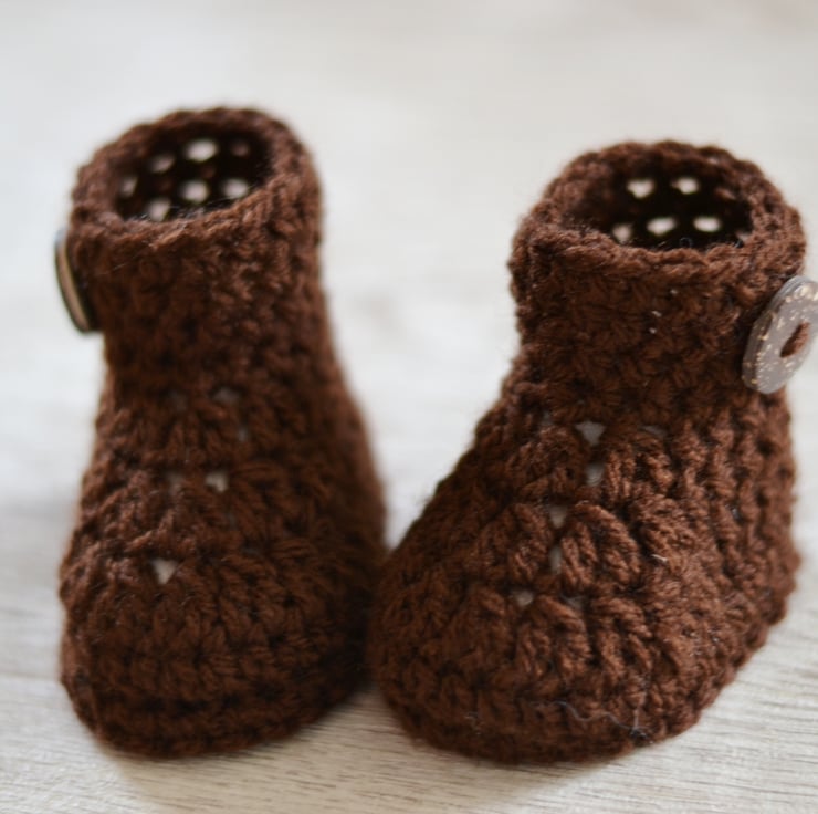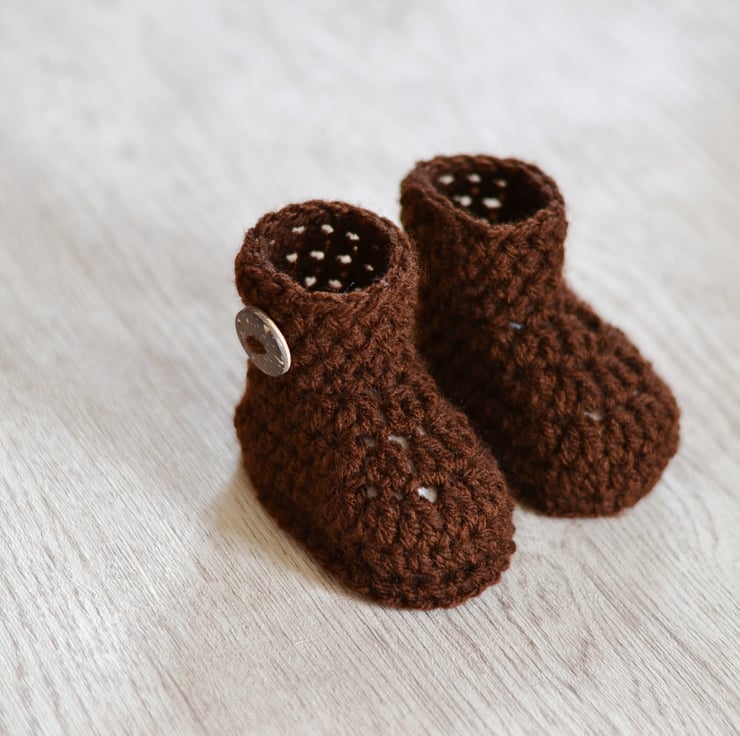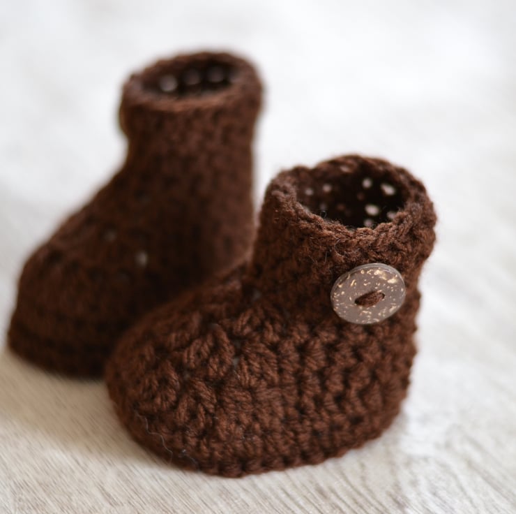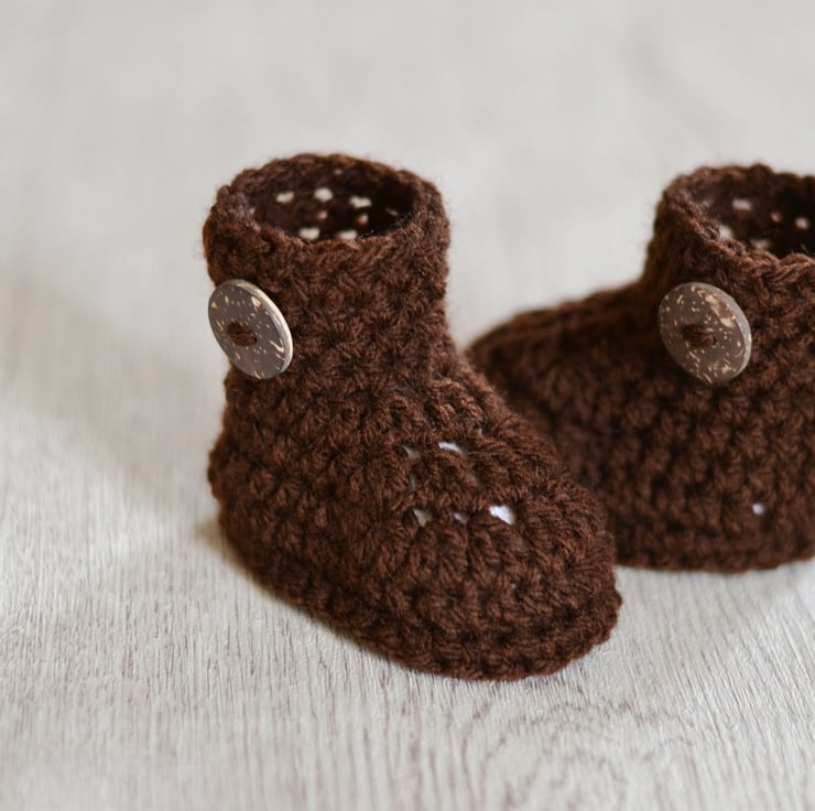 Newborn crochet baby boots. Made in a soft 100% acrylic yarn in a chocolate brown shade. Double thicknress sole and will stand up on their own. Finished with a coconut shell button which I have sewn to one side of the boots.